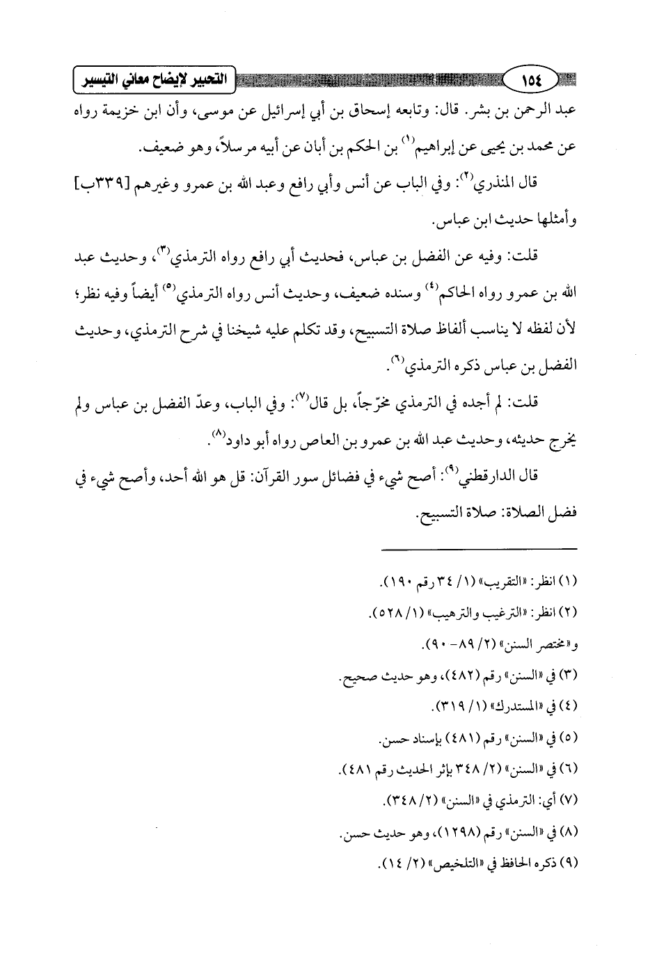 قلت: وفيه عن الفضل بن عباس، فحديث أبي رافع رواه الترمذي (¬3)، وحديث عبد الله بن عمرو رواه الحاكم (¬4) وسنده ضعيف، وحديث أنس رواه الترمذي (¬5) أيضاً وفيه نظر؛ لأن لفظه لا يناسب ألفاظ صلاة التسبيح، وقد تكلم عليه شيخنا في شرح الترمذي، وحديث الفضل بن عباس ذكره الترمذي (¬6).