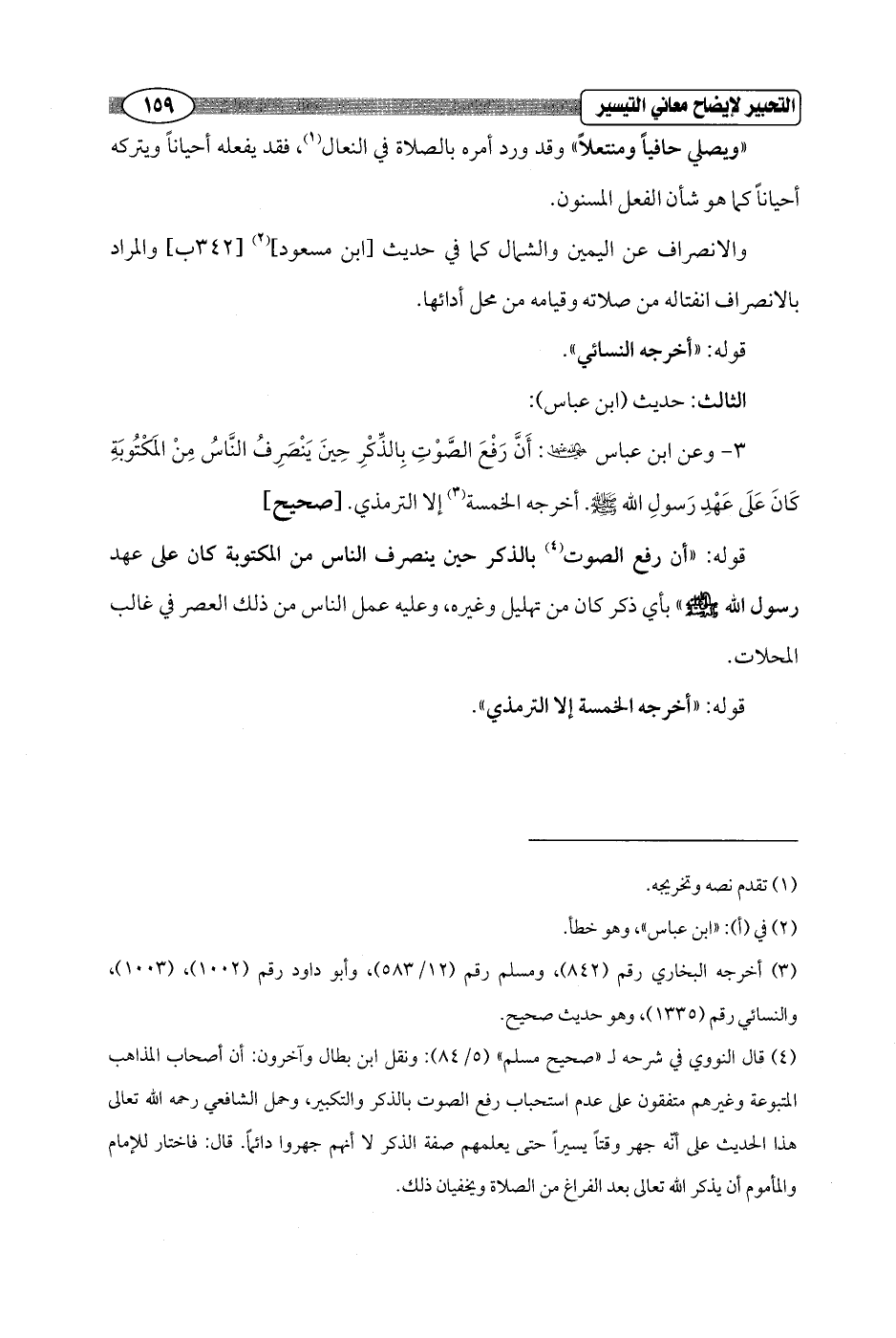 (¬4) قال النووي في شرحه لـ "صحيح مسلم" (5/ 84): ونقل ابن بطال وآخرون: أن أصحاب المذاهب المتبوعة وغيرهم متفقون على عدم استحباب رفع الصوت بالذكر والتكبير، وحمل الشافعي رحمه الله تعالى هذا الحديث على أنّه جهر وقتاً يسيراً حتى يعلمهم صفة الذكر لا أنهم جهروا دائماً. قال: فاختار للإمام والمأموم أن يذكر الله تعالى بعد الفراغ من الصلاة ويخفيان ذلك.