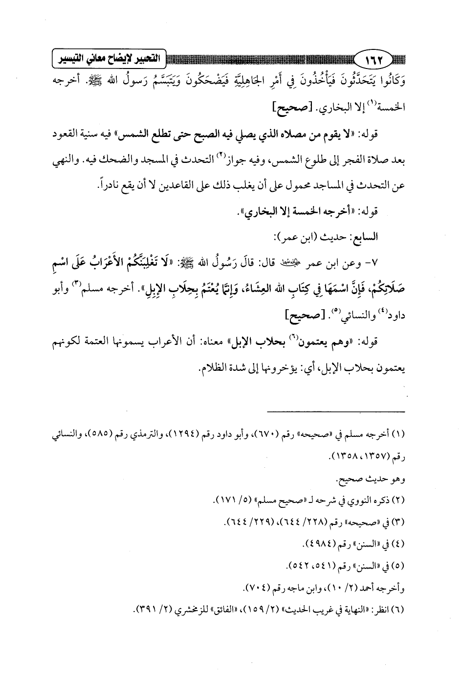 7 - وعن ابن عمر - رضي الله عنهما - قال: قَالَ رَسُولُ الله - صلى الله عليه وسلم -: "لَا تَغْلِبَنَّكُمْ الأَعْرَابُ عَلَى اسْمِ صَلَاتِكُمْ، فَإِنَّ اسْمَهَا فِي كِتَابِ الله العِشَاءُ، وَإِنمَّا يُعْتَمُ بِحِلَابِ الإِبِلِ". أخرجه مسلم (¬3) وأبو داود (¬4) والنسائي (¬5). [صحيح]