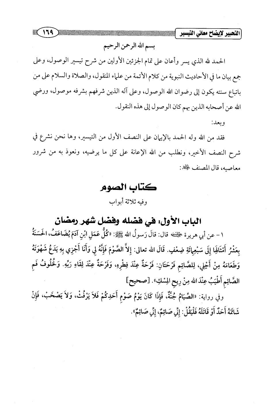 الحمد لله الذي يسر وأعان على تمام الجزئين الأولين من شرح تيسير الوصول، وعلى جمع بيان ما في الأحاديث النبوية من كلام الأئمة من علماء المنقول، والصلاة والسلام على من باتباع سنته يكون إلى رضوان الله الوصول، وعلى آله الذين شرفهم بشرفه موصول، ورضي الله عن أصحابه الذين بهم كان الوصول إلى هذه النقول.