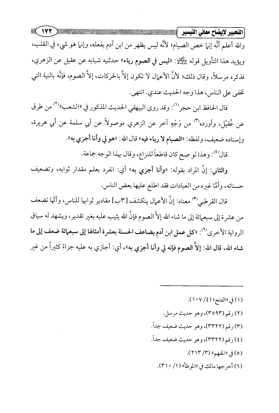 قال الحافظ ابن حجر (¬1): وقد روى البيهقي الحديث المذكور في "الشعب" (¬2) من طرق عن عُقيْل، وأورده (¬3) من وَجْهٍ آخر عن الزهري موصولاً عن أبي سلمة عن أبي هريرة، وإسناده ضعيف، ولفظه: "الصيام لا رياء فيه" قال الله: "هو لي وأنا أجزي به".