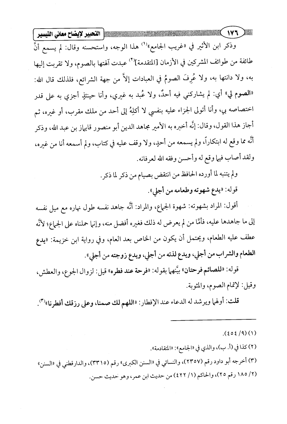 وذكر ابن الأثير في "غريب الجامع" (¬1) هذا الوجه، واستحسنه وقال: لم يسمع أنَّ طائفة من طوائف المشركين في الأزمان [المتقدمة] (¬2) عبدت آلهتها بالصوم، ولا تقربت إليها به، ولا دانتها به، ولا عُرِفَ الصومُ في العبادات إلاَّ من جهة الشرائع، فلذلك قال الله: "الصوم لي" أي: لم يشاركني فيه أحدٌ، ولا عُبد به غيري، وأنا حينئذٍ أجزي به على قدر اختصاصه بي، وأنا أتولى الجزاء عليه بنفسي لا أكلِهُ إلى أحد من ملك مقرب، أو غيره، ثم أجاز هذا القول، وقال: إنَّه أخبره به الأمير مجاهد الدين أبو منصور قايماز بن عبد الله، وذكر أنَّه مما وقع له ابتكاراً، ولم يسمعه من أحدٍ، ولا وقف عليه في كتاب، ولم أسمعه أنا من غيره، ولقد أصاب فيما وقع له وأحسن وفقه الله لعرفانه.