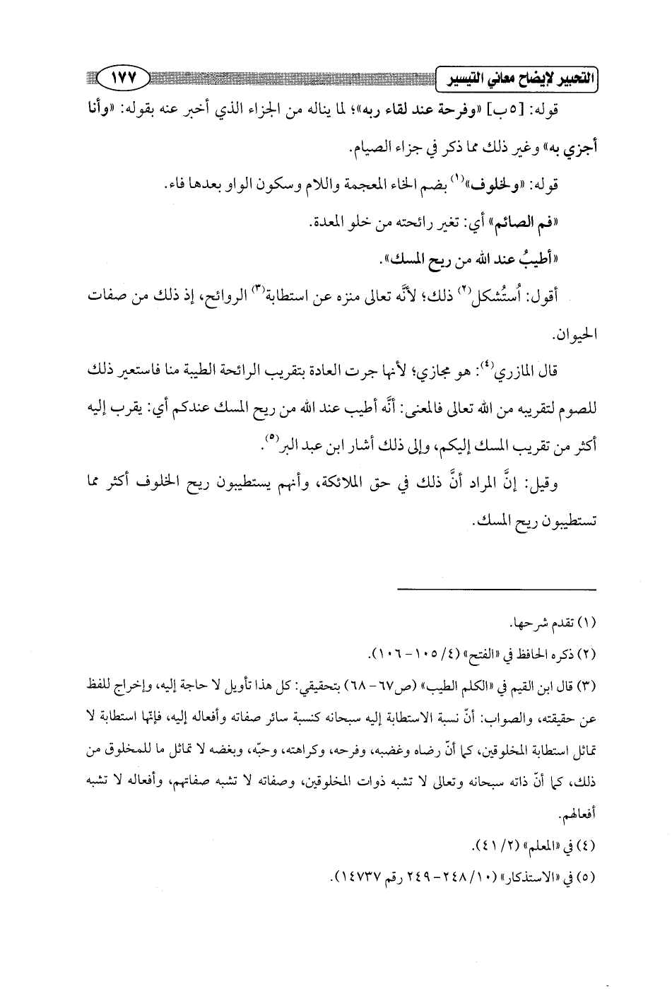 (¬3) قال ابن القيم في "الكلم الطيب" (ص 67 - 68) بتحقيقي: كل هذا تأويل لا حاجة إليه، وإخراج للفظ عن حقيقته، والصواب: أنّ نسبة الاستطابة إليه سبحانه كنسبة سائر صفاته وأفعاله إليه، فإنّها استطابة لا تماثل استطابة المخلوقين، كما أنّ رضاه وغضبه، وفرحه، وكراهته، وحبّه، وبغضه لا تماثل ما للمخلوق من ذلك، كما أنّ ذاته سبحانه وتعالى لا تشبه ذوات المخلوقين، وصفاته لا تشبه صفاتهم، وأفعاله لا تشبه أفعالهم.