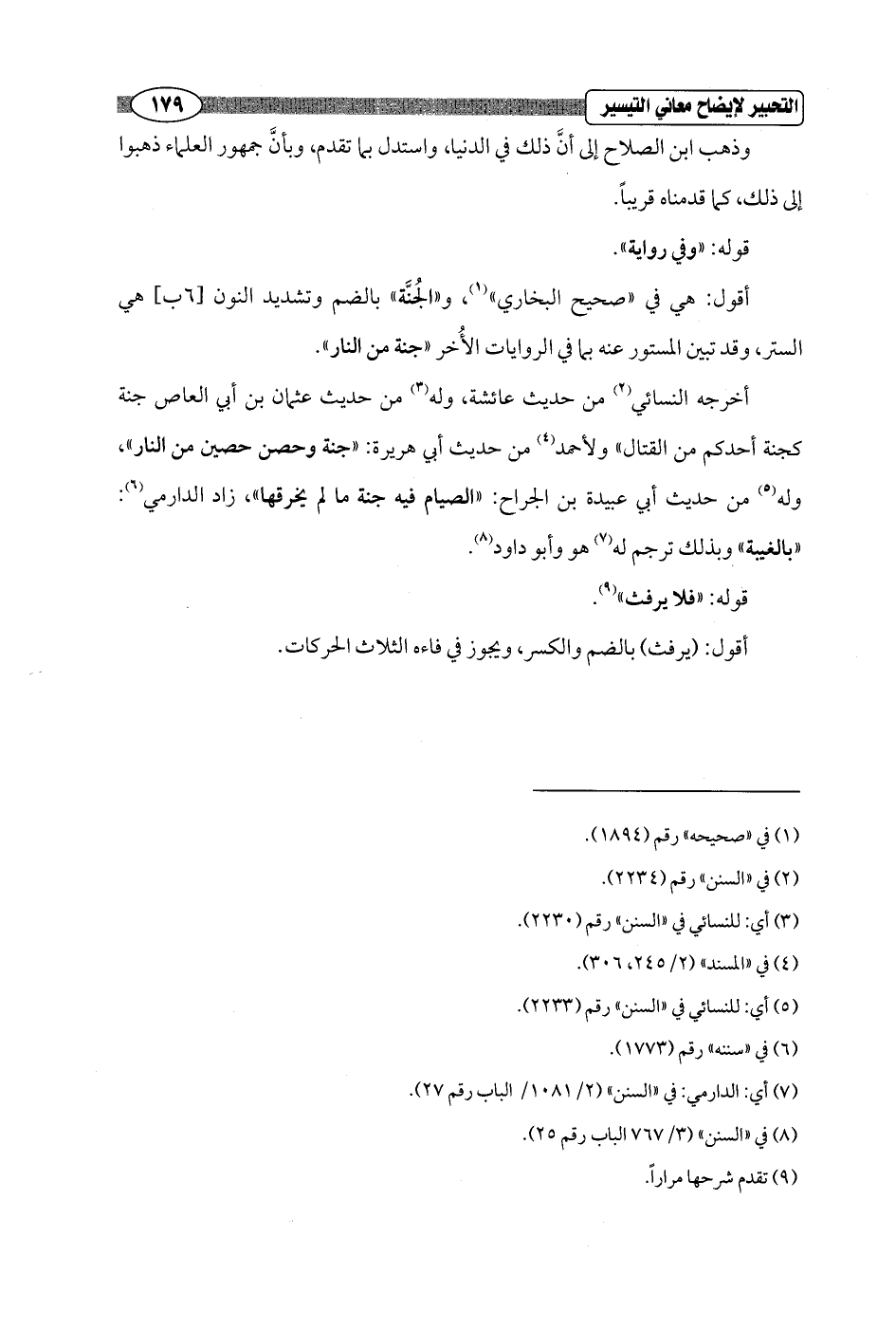 أخرجه النسائي (¬2) من حديث عائشة، وله (¬3) من حديث عثمان بن أبي العاص جنة كجنة أحدكم من القتال" ولأحمد (¬4) من حديث أبي هريرة: "جنة وحصن حصين من النار"، وله (¬5) من حديث أبي عبيدة بن الجراح: "الصيام فيه جنة ما لم يخرقها"، زاد الدارمي (¬6): "بالغيبة" وبذلك ترجم له (¬7) هو وأبو داود (¬8).