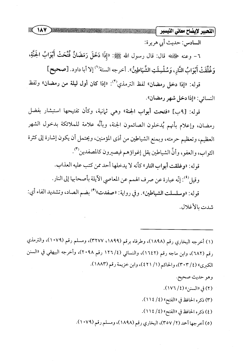 6 - وعنه - رضي الله عنه - قال: قال رسول الله - صلى الله عليه وسلم -: "إِذَا دَخَلَ رَمَضَانُ فُتِّحَتْ أَبْوَابُ الجَنَّةِ, وَغُلِّقَتْ أَبْوَابُ النَّارِ، وَسُلْسِلَتِ الشَّيَاطِينُ". أخرجه الستة (¬1) إلا أبا داود. [صحيح]