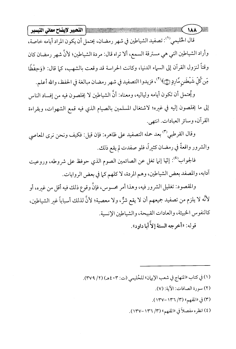 قال الحُليمي (¬1): تصفيد الشياطين في شهر رمضان، يحتمل أن يكون المراد أيامه خاصة، وأراد الشياطين التي هي مسترقة السمع، ألا تراه قال: مردة الشياطين؛ لأنَّ شهر رمضان كان وقتاً لنزول القرآن إلى السماء الدنيا، وكانت الحراسة قد وقعت بالشهب، كما قال: {وَحِفْظًا مِنْ كُلِّ شَيْطَانٍ مَارِدٍ (7)} (¬2)، فزيدوا التصفيد في شهر رمضان مبالغة في الحفظ، والله أعلم.