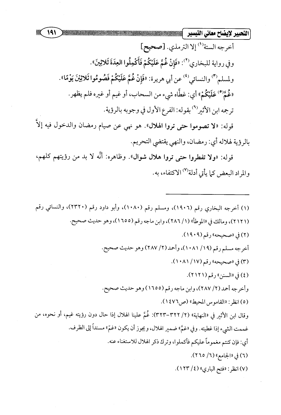 وقال ابن الأثير في "النهاية" (2/ 322 - 323): غُمَّ علينا الهلال إذا حال دون رؤيته غيم، أو نحوه، من غممت الشيء إذا غطيته. وفي "غمَّ" ضمير الهلال، ويجوز أن يكون "غمّ" مسنداً إلى الظرف.