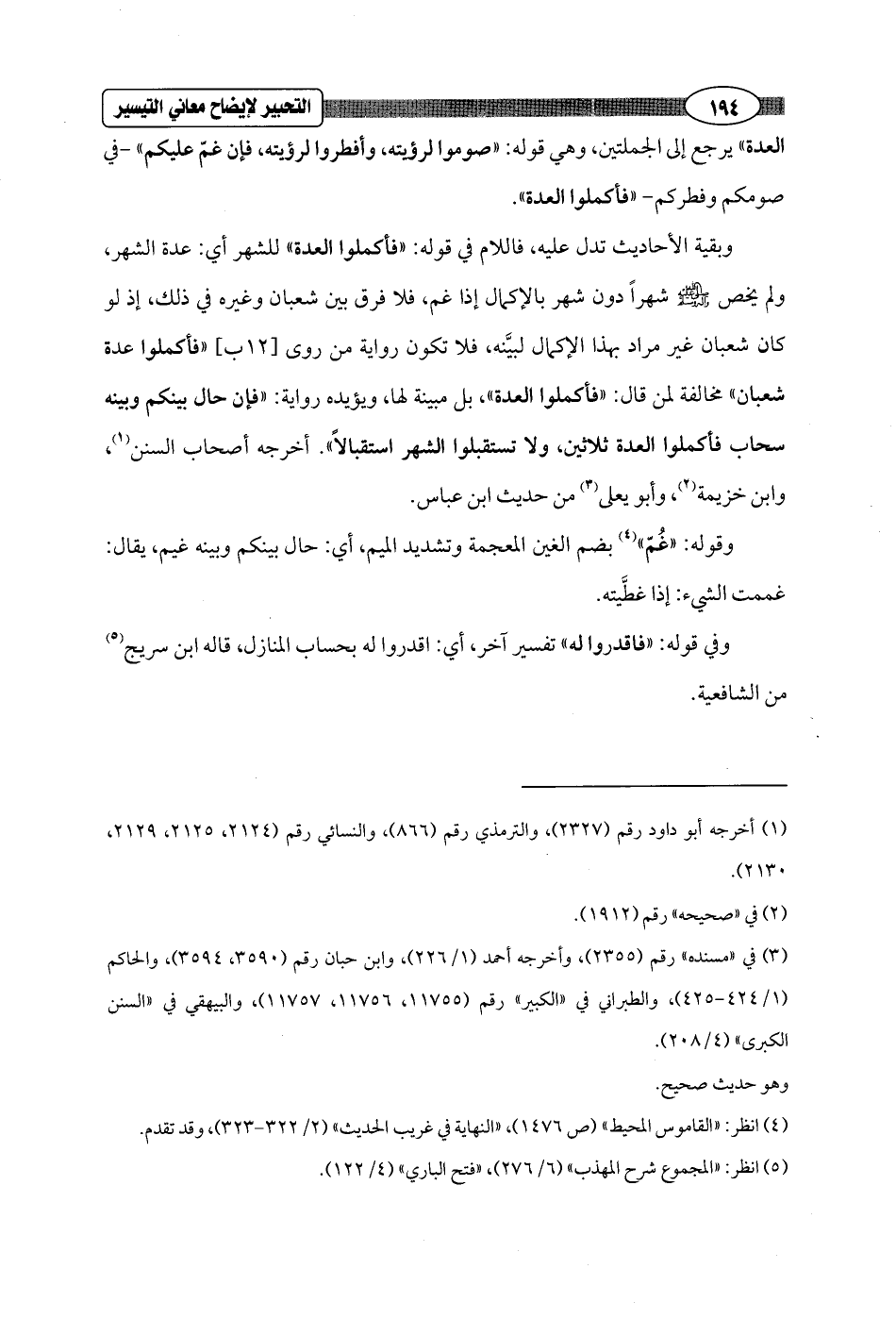 وبقية الأحاديث تدل عليه، فاللام في قوله: "فأكملوا العدة" للشهر أي: عدة الشهر، ولم يخص - صلى الله عليه وسلم - شهراً دون شهر بالإكمال إذا غم، فلا فرق بين شعبان وغيره في ذلك، إذ لو كان شعبان غير مراد بهذا الإكمال لبيَّنه، فلا تكون رواية من روى [12 ب] "فأكملوا عدة شعبان" مخالفة لمن قال: "فأكملوا العدة"، بل مبينة لها، ويؤيده رواية: "فإن حال بينكم وبينه سحاب فأكملوا العدة ثلاثين، ولا تستقبلوا الشهر استقبالاً". أخرجه أصحاب السنن (¬1)، وابن خزيمة (¬2)، وأبو يعلى (¬3) من حديث ابن عباس.