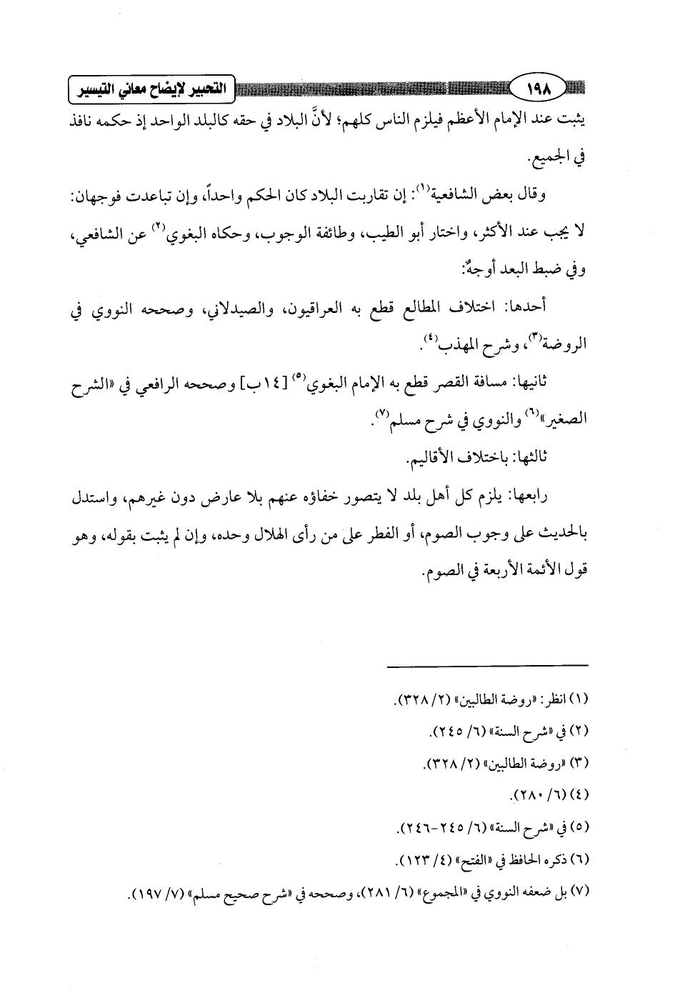 رابعها: يلزم كل أهل بلد لا يتصور خفاؤه عنهم بلا عارض دون غيرهم، واستدل بالحديث على وجوب الصوم، أو الفطر على من رأى الهلال وحده، وإن لم يثبت بقوله، وهو قول الأئمة الأربعة في الصوم.