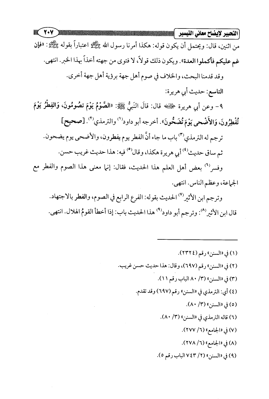 9 - وعن أبي هريرة - رضي الله عنه - قال: قَالَ النَبيُّ - صلى الله عليه وسلم -: "الصَّوْمُ يَوْمَ تصُومُونَ، وَالفِطْرُ يَوْمَ تُفْطِرُونَ، وَالأَضْحى يَوْمَ تُضَحُّونَ". أخرجه أبو داود (¬1) والترمذي (¬2). [صحيح]