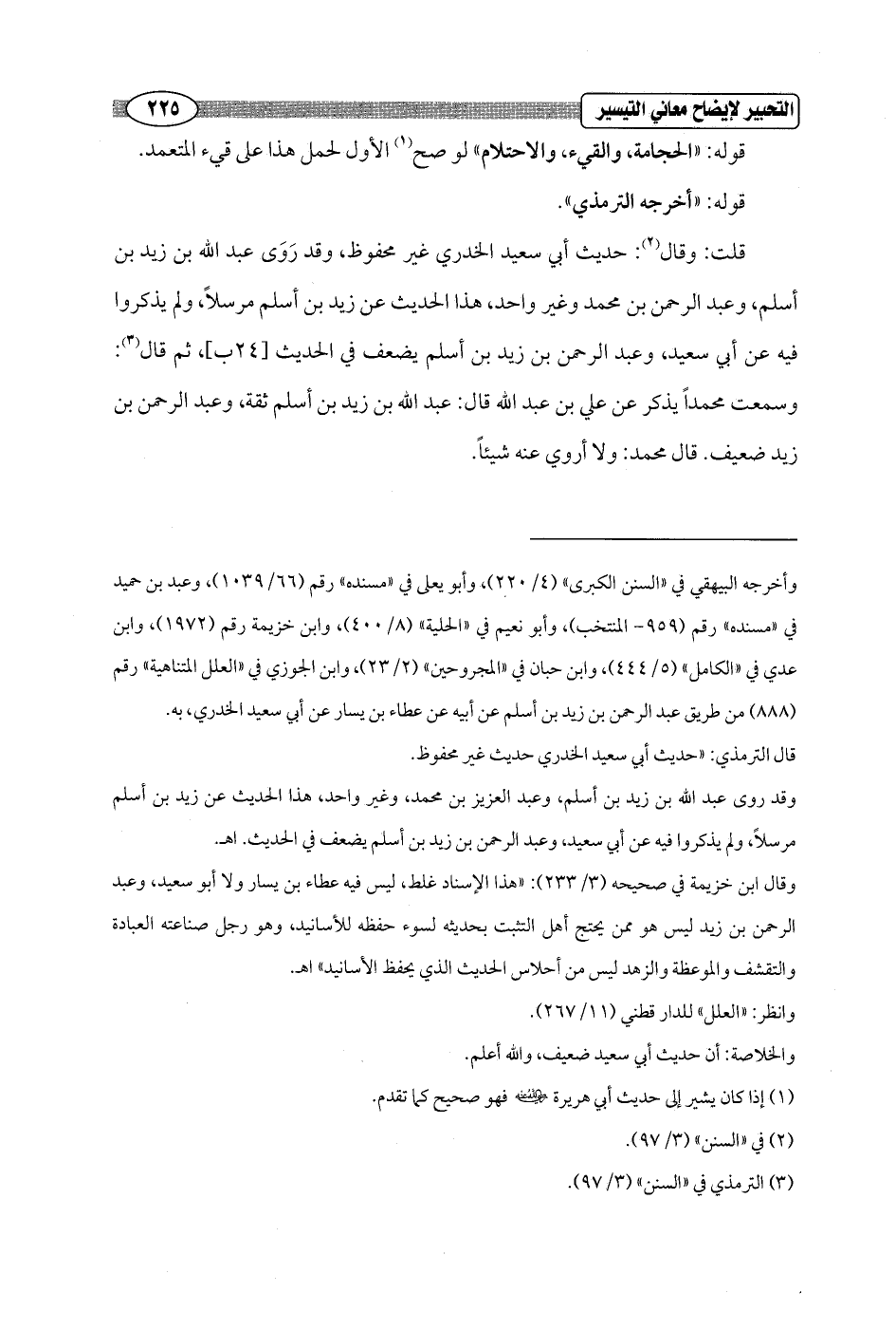 وقال ابن خزيمة في صحيحه (3/ 233): "هذا الإسناد غلط، ليس فيه عطاء بن يسار ولا أبو سعيد، وعبد الرحمن بن زيد ليس هو ممن يحتج أهل التثبت بحديثه لسوء حفظه للأسانيد، وهو رجل صناعته العبادة والتقشف والموعظة والزهد ليس من أحلاس الحديث الذي يحفظ الأسانيد" اهـ.