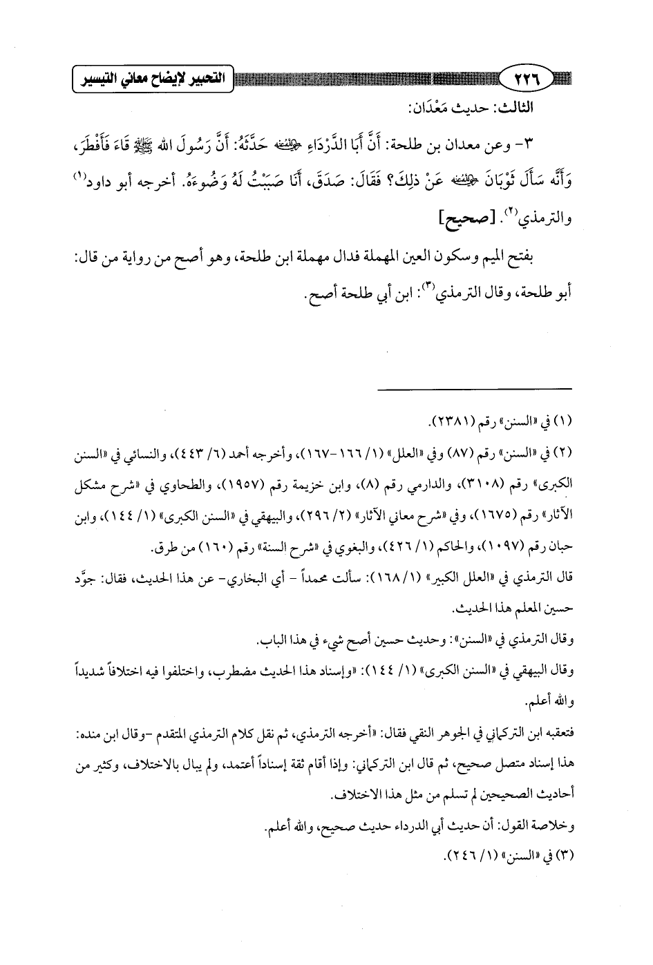 3 - وعن معدان بن طلحة: أَنَّ أَبَا الدَّرْدَاءِ - رضي الله عنه - حَدَّثَهُ: أَنَّ رَسُولَ الله - صلى الله عليه وسلم - قَاءَ فَأَفْطَرَ، وَأنَّه سَأَلَ ثَوْبَانَ - رضي الله عنه - عَنْ ذلِكَ؟ فَقَالَ: صَدَقَ، أَنَا صَبَبْتُ لَهُ وَضُوءَهُ. أخرجه أبو داود (¬1) والترمذي (¬2). [صحيح]