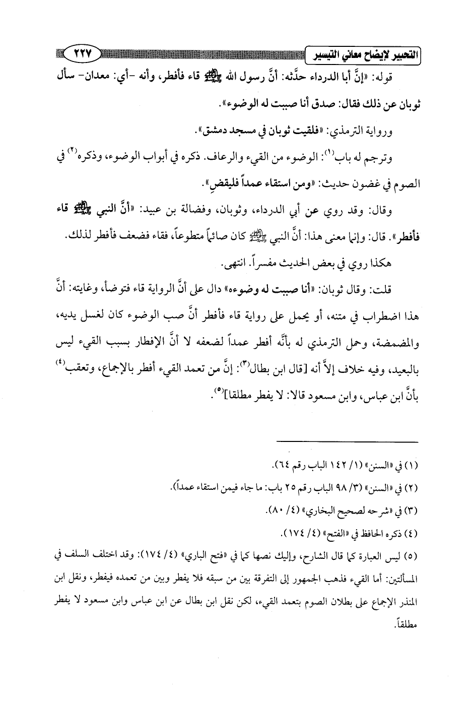(¬5) ليس العبارة كما قال الشارح، وإليك نصها كما في "فتح الباري" (4/ 174): وقد اختلف السلف في المسألتين: أما القيء فذهب الجمهور إلى التفرقة بين من سبقه فلا يفطر وبين من تعمده فيفطر، ونقل ابن المنذر الإجماع على بطلان الصوم بتعمد القيء، لكن نقل ابن بطال عن ابن عباس وابن مسعود لا يفطر مطلقاً.