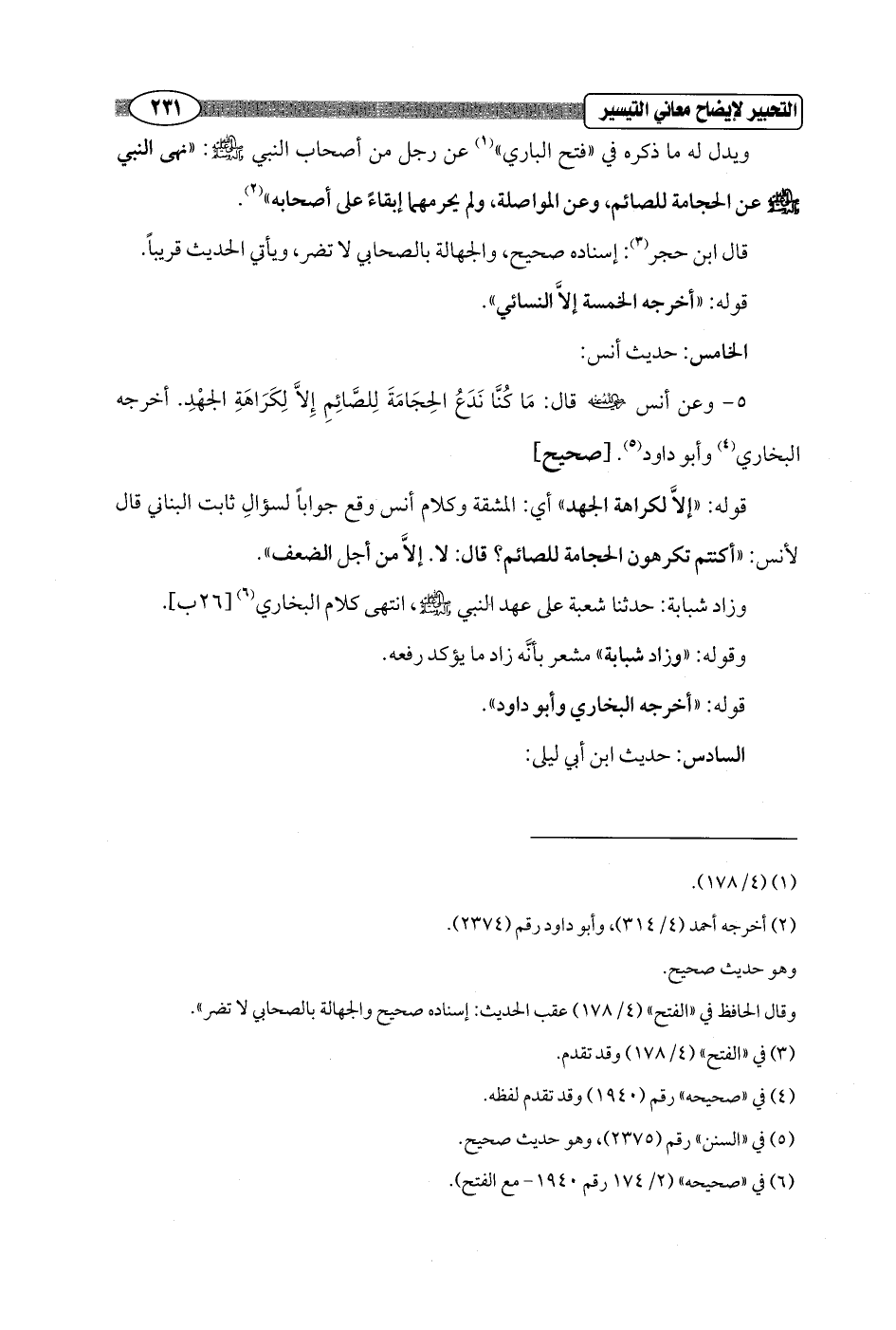 5 - وعن أنس - رضي الله عنه - قال: مَا كُنَّا نَدَعُ الحِجَامَةَ لِلصَّائِمِ إِلاَّ لِكَرَاهَةِ الجهْدِ. أخرجه البخاري (¬4) وأبو داود (¬5). [صحيح]