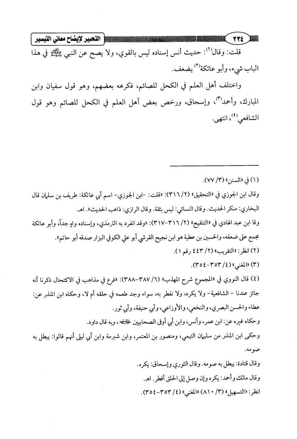 (¬4) قال النووي في "المجموع شرح المهذب" (6/ 387 - 388): "فرع في مذاهب في الاكتحال ذكرنا أنه جائز عندنا - الشافعية - ولا يكره، ولا نفطر به، سواء وجد طعمه في حلقه أم لا، وحكاه ابن المنذر عن: عطاء والحسن البصري، والنخعي، والأوزاعي، وأبي حنيفة، وأبي ثور.
