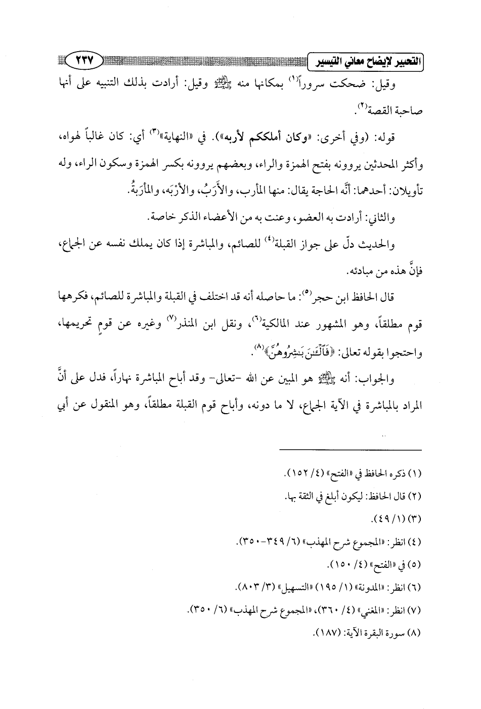 والجواب: أنه - صلى الله عليه وسلم - هو المبين عن الله - تعالى - وقد أباح المباشرة نهاراً، فدل على أنَّ المراد بالمباشرة في الآية الجماع، لا ما دونه، وأباح قوم القبلة مطلقاً، وهو المنقول عن أبي