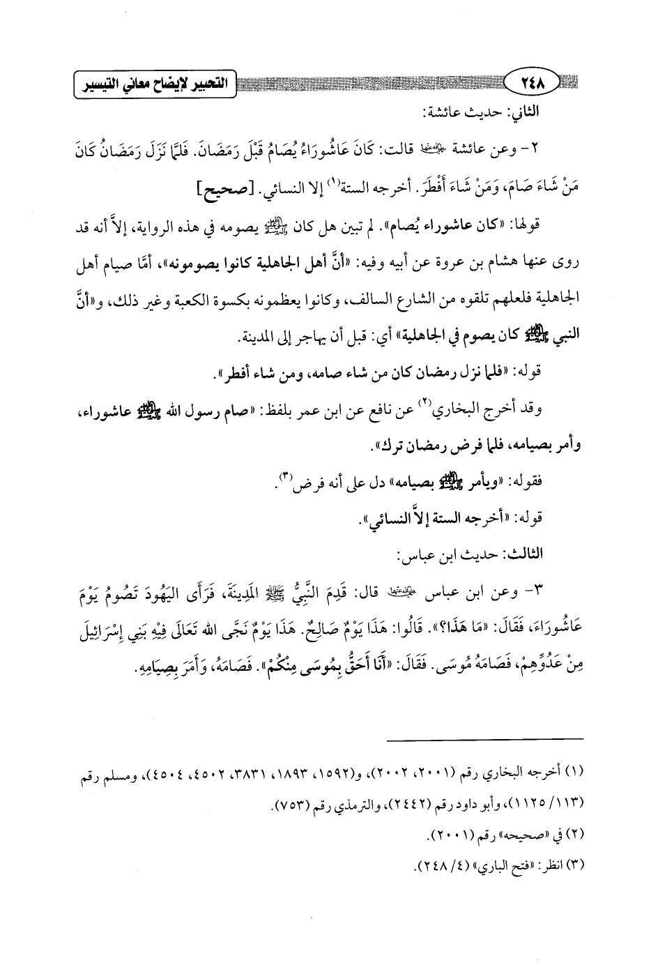 3 - وعن ابن عباس - رضي الله عنهما - قال: قَدِمَ النَّبِيُّ - صلى الله عليه وسلم - المَدِينَةَ، فَرَأَى اليَهُودَ تَصُومُ يَوْمَ عَاشُورَاءَ، فَقَالَ: "مَا هَذَا؟ ". قَالُوا: هَذَا يَوْمٌ صَالِحٌ. هَذَا يَوْمٌ نَجَّى الله تَعَالَى فِيْهِ بَنِي إِسْرَائِيلَ مِنْ عَدُوِّهِمْ، فَصَامَهُ مُوسَى. فَقَالَ: "أَنَا أَحَقُّ بِمُوسَى مِنْكُمْ". فَصَامَهُ، وَأَمَرَ بِصِيَامِهِ.