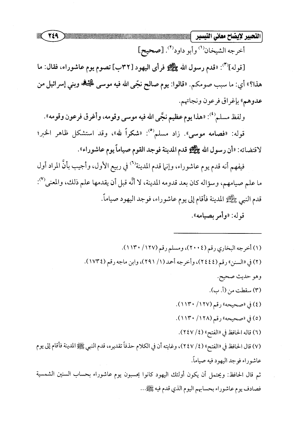 (¬7) قال الحافظ في "الفتح" (4/ 247)، وغايته أن في الكلام حذفاً تقديره، قدم النبي - صلى الله عليه وسلم - المدينة فأقام إلى يوم عاشوراء فوجد اليهود فيه صياماً.