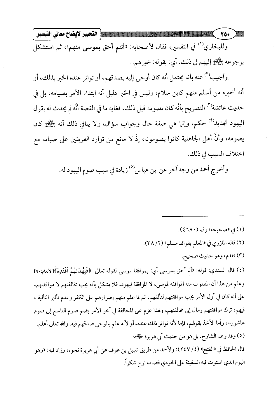 (¬4) قال السندي: قوله: "أنا أحق بموسى أي: بموافقة موسى لقوله تعالى: {فَبِهُدَاهُمُ اقْتَدِهْ} [الأنعام: 90] وعلم من هذا أن المطلوب منه الموافقة لموسى، لا الموافقة ليهود، فلا يشكل بأنه يجب مخالفتهم لا موافقتهم، على أنه كان في أول الأمر يجب موافقتهم لتألفهم، ثم لا علم منهم إصرارهم على الكفر وعدم تأثير التأليف فيهم، ترك موافقتهم ومال إلى مخالفتهم، ولهذا عزم على المخالفة في آخر الأمر بضم صوم التاسع إلى صوم عاشوراء، وأما الأخذ بقولهم، فإما لأنه تواتر ذلك عنده، أو لأنه علم بالوحي صدقهم فيه. والله تعالى أعلم.