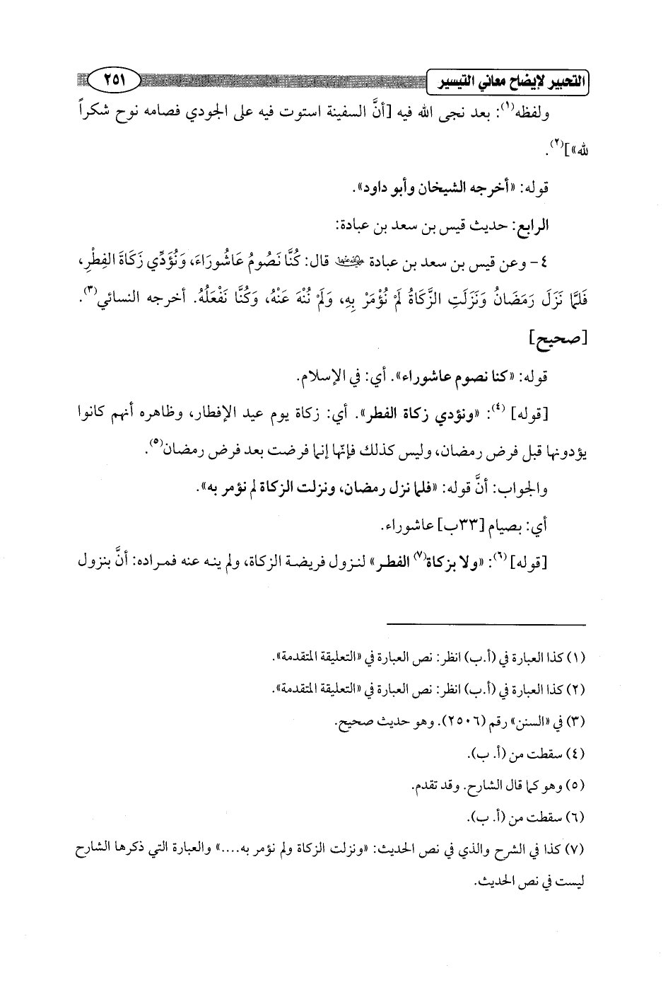 4 - وعن قيس بن سعد بن عبادة - رضي الله عنهما - قال: كُنَّا نَصُومُ عَاشُورَاءَ، وَنُؤَدِّي زَكَاةَ الفِطْرِ، فَلمَّا نَزَلَ رَمَضَانُ وَنَزَلَتِ الزَّكَاةُ لَمْ نُؤْمَرْ بِهِ، وَلَمْ نُنْهَ عَنْهُ، وَكُنَّا نَفْعَلُهُ. أخرجه النسائي (¬3). [صحيح]