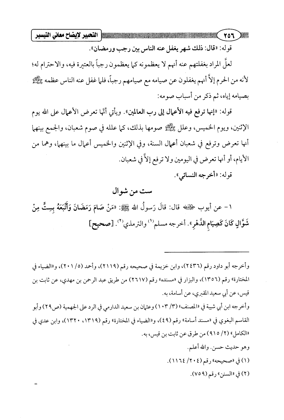 1 - عن أيوب - رضي الله عنه - قال: قَالَ رَسولُ الله - صلى الله عليه وسلم -: "مَنْ صَامَ رَمَضَانَ وَأَتْبَعَهُ بِسِتٍّ مِنْ شَوَّالٍ كَانَ كَصِيَامِ الدَّهْرِ". أخرجه مسلم (¬1) والترمذي (¬2). [صحيح]