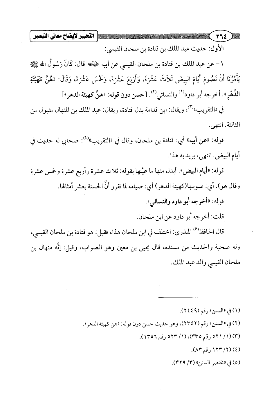 1 - عن عبد الملك بن قتادة بن ملحان القيسي عن أبيه - رضي الله عنه - قال: كَانَ رَسُولُ الله - صلى الله عليه وسلم - يَأْمُرُنَا أَنْ نَصُومَ أَيّامَ البِيضَ ثَلاَثَ عَشْرَةَ، وَأَرْبَعَ عَشْرَةَ، وَخَمْسَ عَشْرَةَ، وَقَالَ: "هُنَّ كَهَيْئَةِ الدَّهْرِ". أخرجه أبو داود (¬1) والنسائي (¬2). [حسن دون قوله: "هنَّ كهيئة الدهر"]