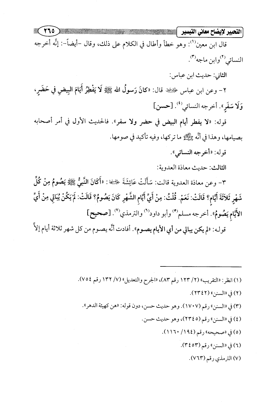 2 - وعن ابن عباس - رضي الله عنهما - قال: "كانَ رَسولُ الله - صلى الله عليه وسلم - لَا يَفْطِرُ أَيَامَ البِيضِ في حَضَرٍ، وَلَا سَفَرٍ". أخرجه النسائي (¬4). [حسن]