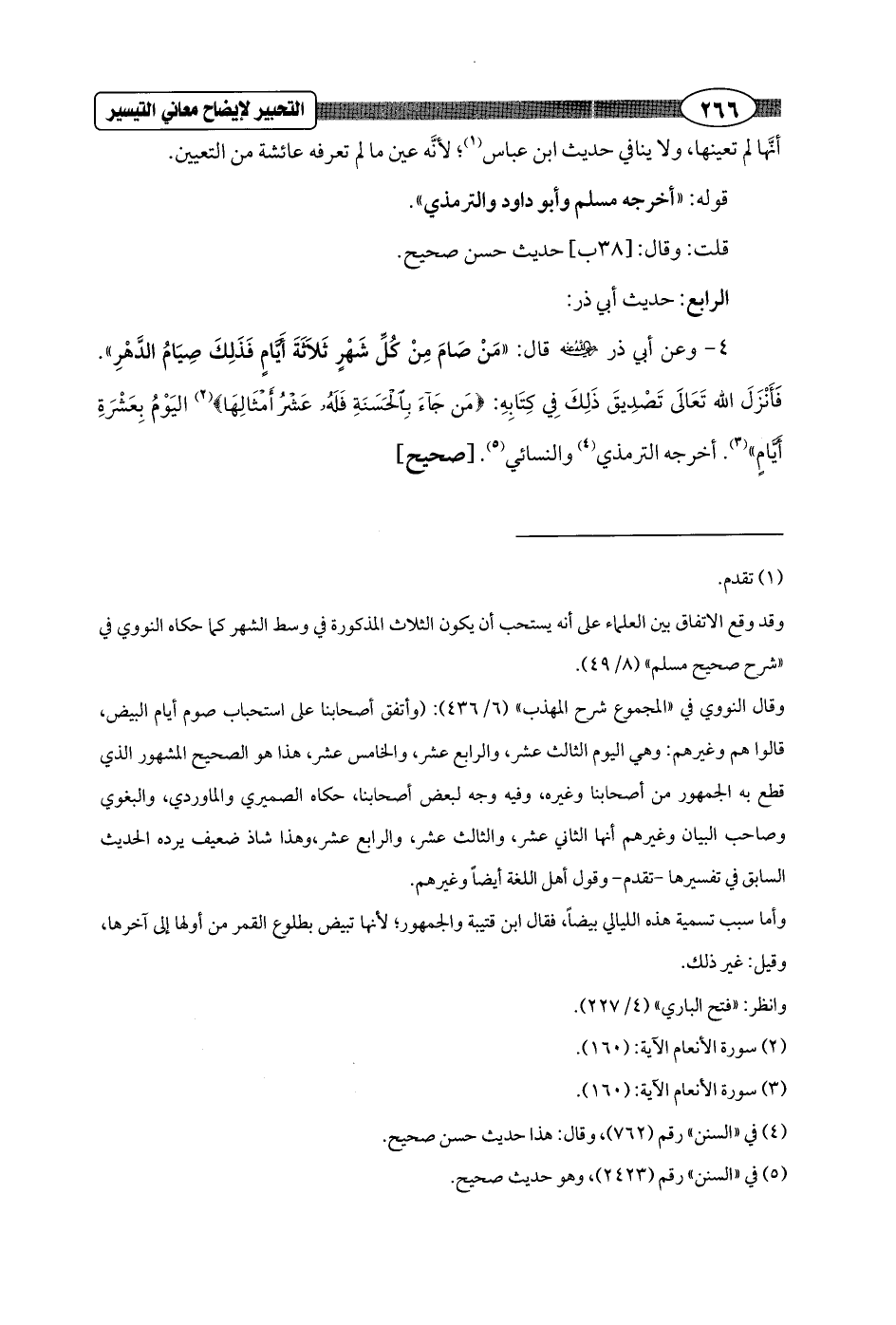 4 - وعن أبي ذر - رضي الله عنه - قال: "مَنْ صَامَ مِنْ كُلِّ شَهْرٍ ثَلاَثَةَ أَيَّامٍ فَذَلِكَ صِيَامُ الدَّهْرِ". فَأَنْزَلَ الله تَعَالَى تَصْدِيقَ ذَلِكَ فِي كِتَابِهِ: {مَنْ جَاءَ بِالْحَسَنَةِ فَلَهُ عَشْرُ أَمْثَالِهَا} (¬2) اليَوْمُ بِعَشْرَةِ أَيَّامٍ" (¬3). أخرجه الترمذي (¬4) والنسائي (¬5). [صحيح]