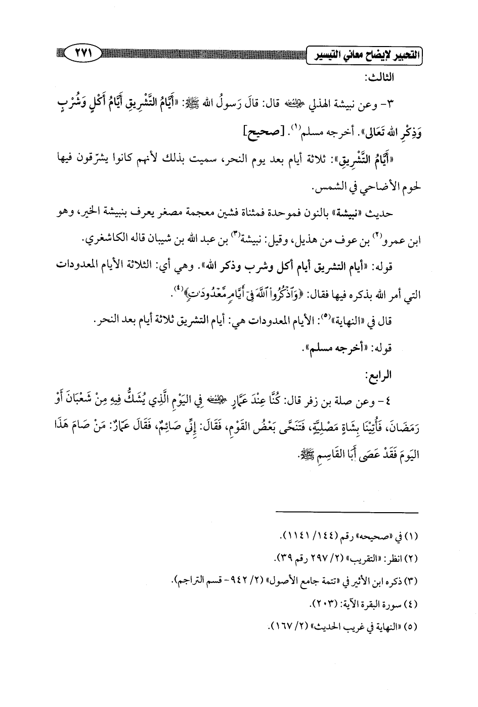 3 - وعن نبيشة الهذلي - رضي الله عنه - قال: قَالَ رَسولُ الله - صلى الله عليه وسلم -: "أَيَّامُ التَّشْرِيقِ أَيَّامُ أَكْلٍ وَشُرْبٍ وَذِكْرِ الله تَعَالى". أخرجه مسلم (¬1). [صحيح]