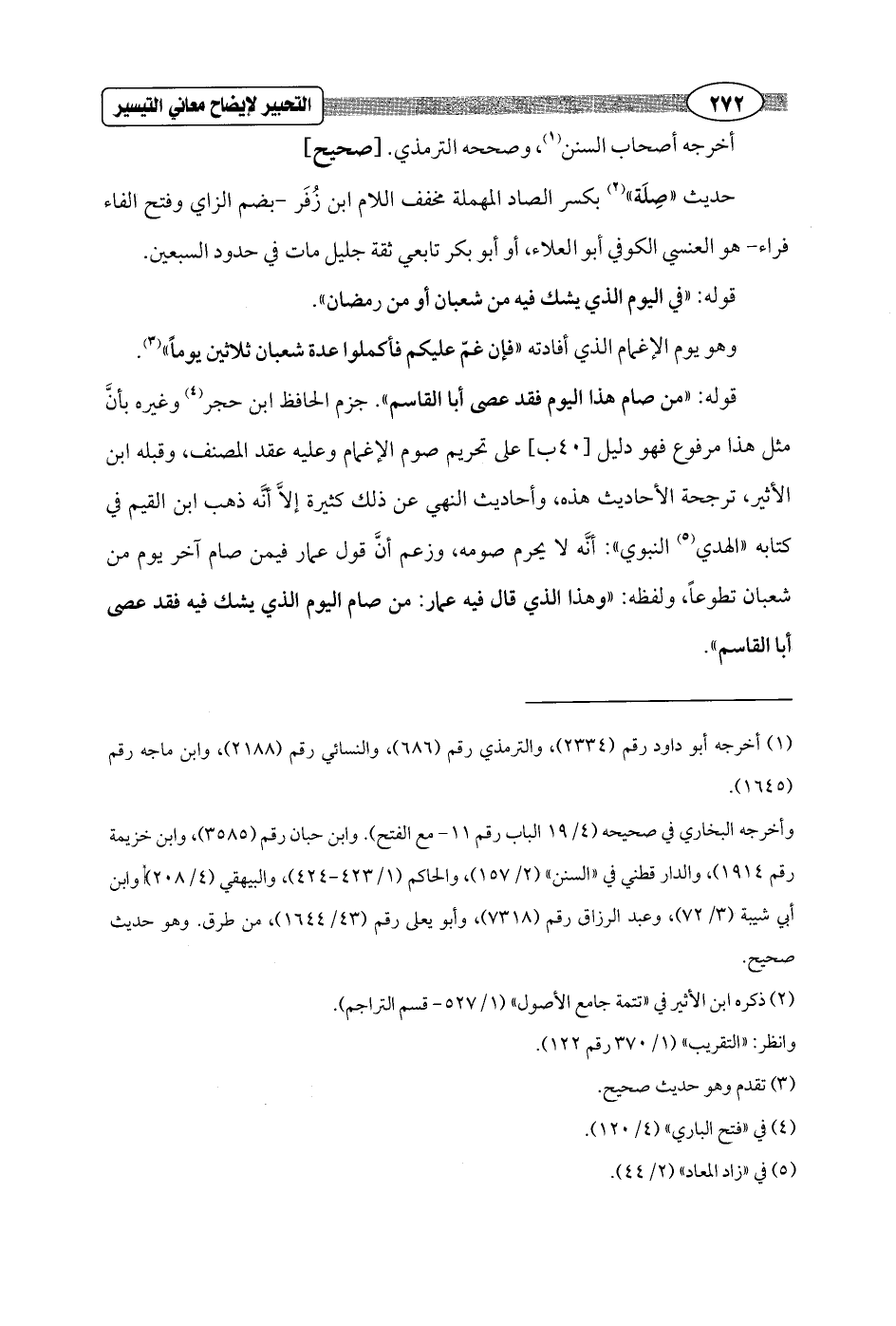 قوله: "من صام هذا اليوم فقد عصى أبا القاسم". جزم الحافظ ابن حجر (¬4) وغيره بأنَّ مثل هذا مرفوع فهو دليل [40 ب] على تحريم صوم الإغمام وعليه عقد المصنف، وقبله ابن الأثير، ترجحة الأحاديث هذه، وأحاديث النهي عن ذلك كثيرة إلاَّ أَنَّه ذهب ابن القيم في كتابه "الهدي (¬5) النبوي": أنَّه لا يحرم صومه, وزعم أنَّ قول عمار فيمن صام آخر يوم من شعبان تطوعاً، ولفظه: "وهذا الذي قال فيه عمار: من صام اليوم الذي يشك فيه فقد عصى أبا القاسم".