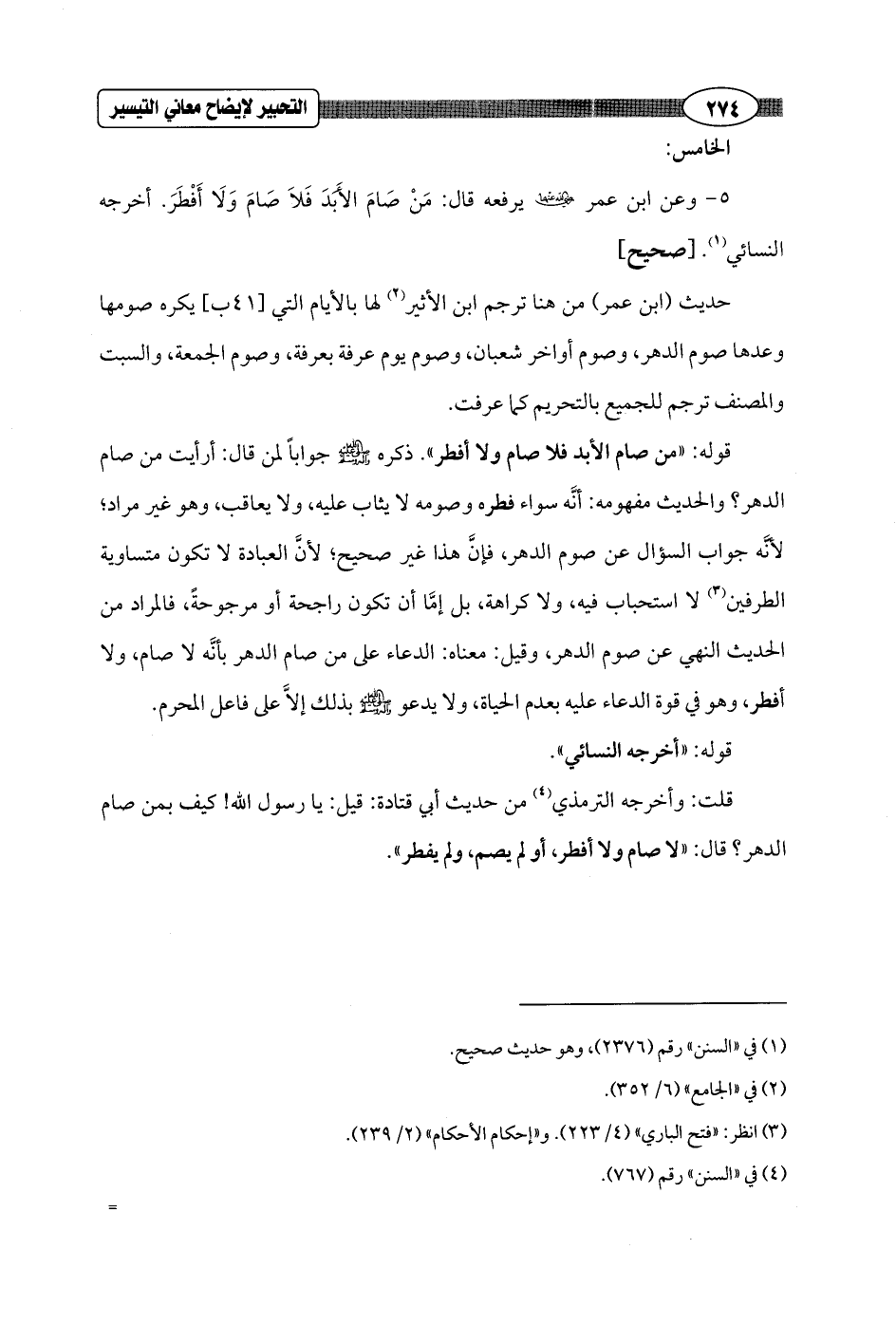 5 - وعن ابن عمر - رضي الله عنهما - يرفعه قال: مَنْ صَامَ الأَبَدَ فَلاَ صَامَ وَلَا أَفْطَرَ. أخرجه النسائي (¬1). [صحيح]