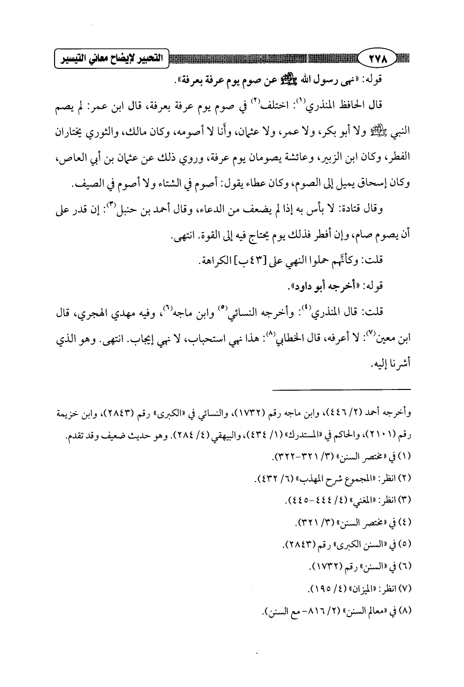 قال الحافظ المنذري (¬1): اختلف (¬2) في صوم يوم عرفة بعرفة، قال ابن عمر: لم يصم النبي - صلى الله عليه وسلم - ولا أبو بكر، ولا عمر، ولا عثمان، وأَنا لا أصومه، وكان مالك، والثوري يختاران الفطر، وكان ابن الزبير، وعائشة يصومان يوم عرفة, وري ذلك عن عثمان بن أبي العاص، وكان إسحاق يميل إلى الصوم، وكان عطاء يقول: أصوم في الشتاء ولا أصوم في الصيف.