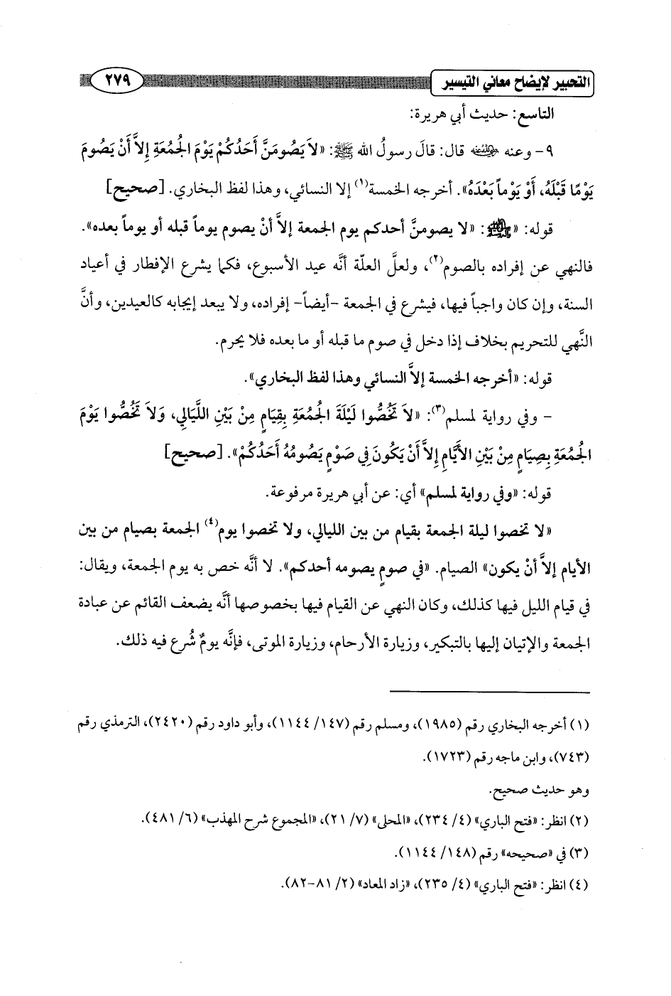 9 - وعنه - رضي الله عنه - قال: قَالَ رسولُ الله - صلى الله عليه وسلم -: "لاَ يَصُومَنَّ أَحَدُكُمْ يَوْمَ الجُمُعَةِ إِلاَّ أَنْ يَصُومَ يَوْمًا قَبْلَهُ, أَوْ يَوْماً بَعْدَهُ". أخرجه الخمسة (¬1) إلا النسائي، وهذا لفظ البخاري. [صحيح]