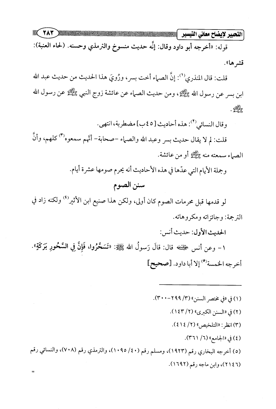 1 - وعن أنس - رضي الله عنه - قال: قَالَ رَسولُ الله - صلى الله عليه وسلم -: "تَسَحَّرُوا، فَإِنَّ فِي السَّحُورِ بَرَكَةٍ". أخرجه الخمسة (¬5) إلا أبا داود. [صحيح]