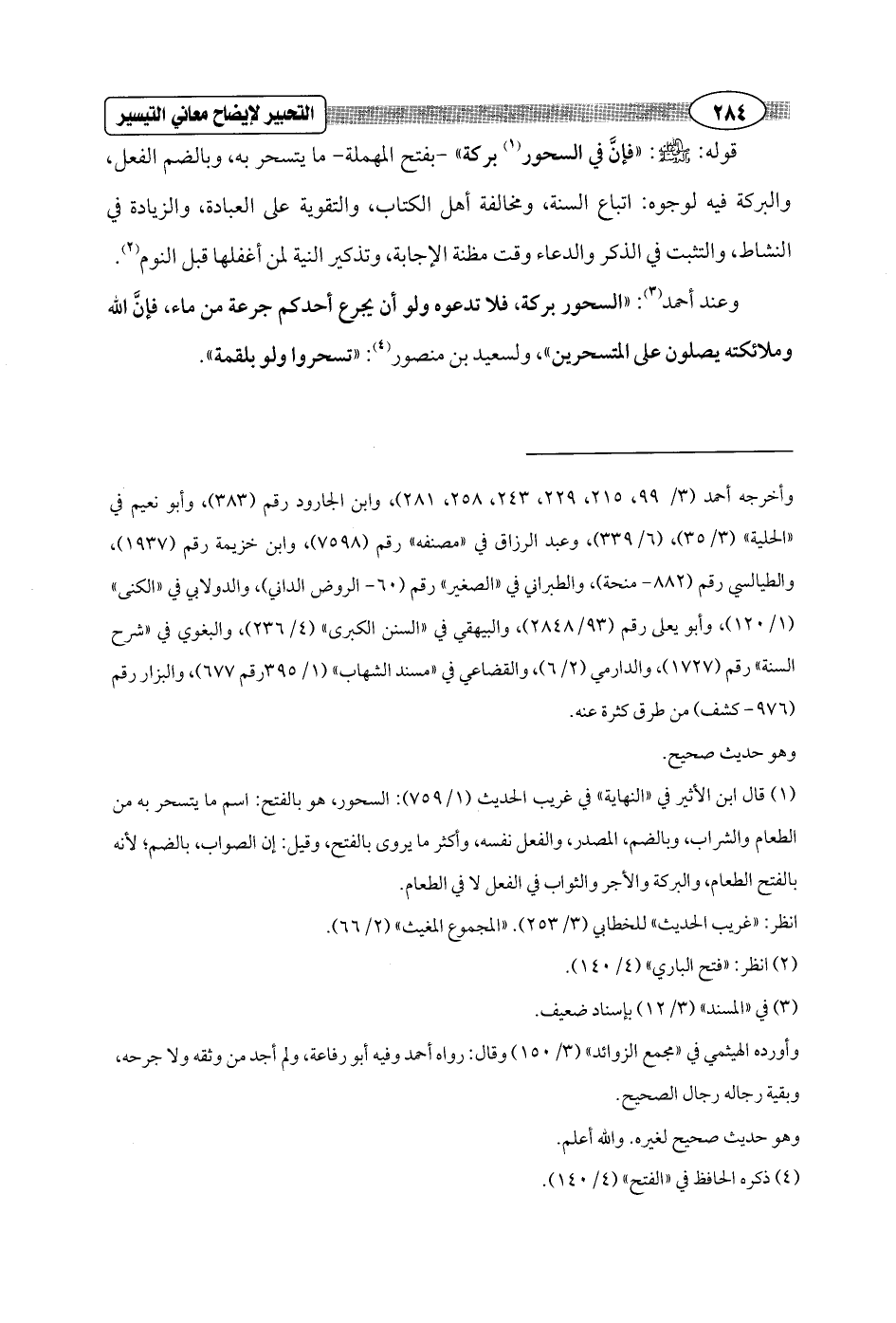 (¬1) قال ابن الأثير في "النهاية" في غريب الحديث (1/ 759): السحور، هو بالفتح: اسم ما يتسحر به من الطعام والشراب، وبالضم، المصدر، والفعل نفسه, وأكثر ما يروى بالفتح، وقيل: إن الصواب، بالضم؛ لأنه بالفتح الطعام، والبركة والأجر والثواب في الفعل لا في الطعام.