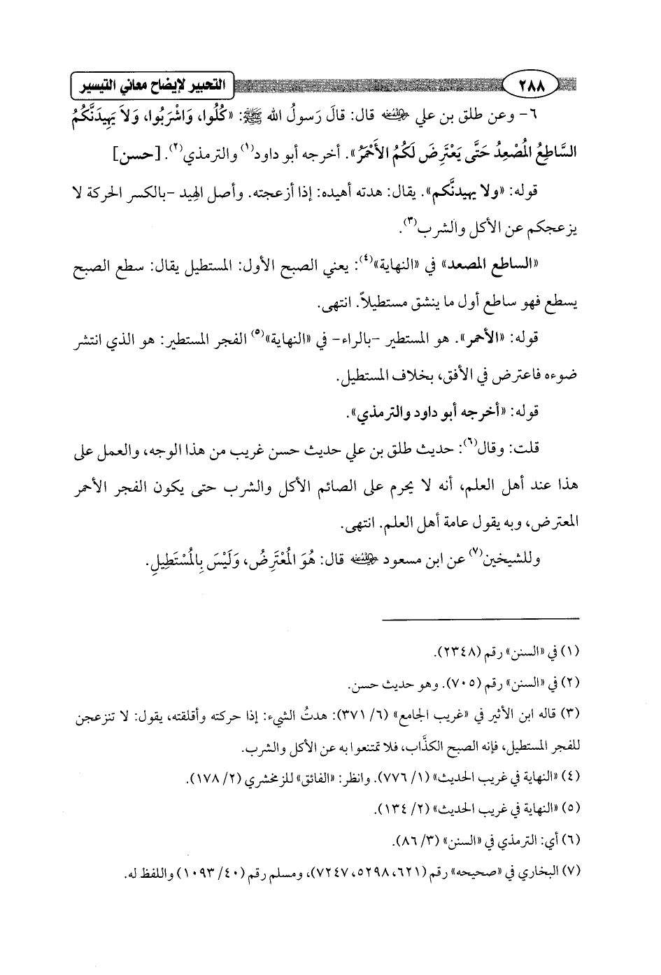 6 - وعن طلق بن علي - رضي الله عنه - قال: قَالَ رَسولُ الله - صلى الله عليه وسلم -: "كُلُوا، وَاشْرَبُوا، وَلاَ يَهِيدَنَّكُمُ السَّاطِعُ المُصْعِدُ حَتَّى يَعْتَرِضَ لَكُمُ الأَحْمَرُ". أخرجه أبو داود (¬1) والترمذي (¬2). [حسن]
