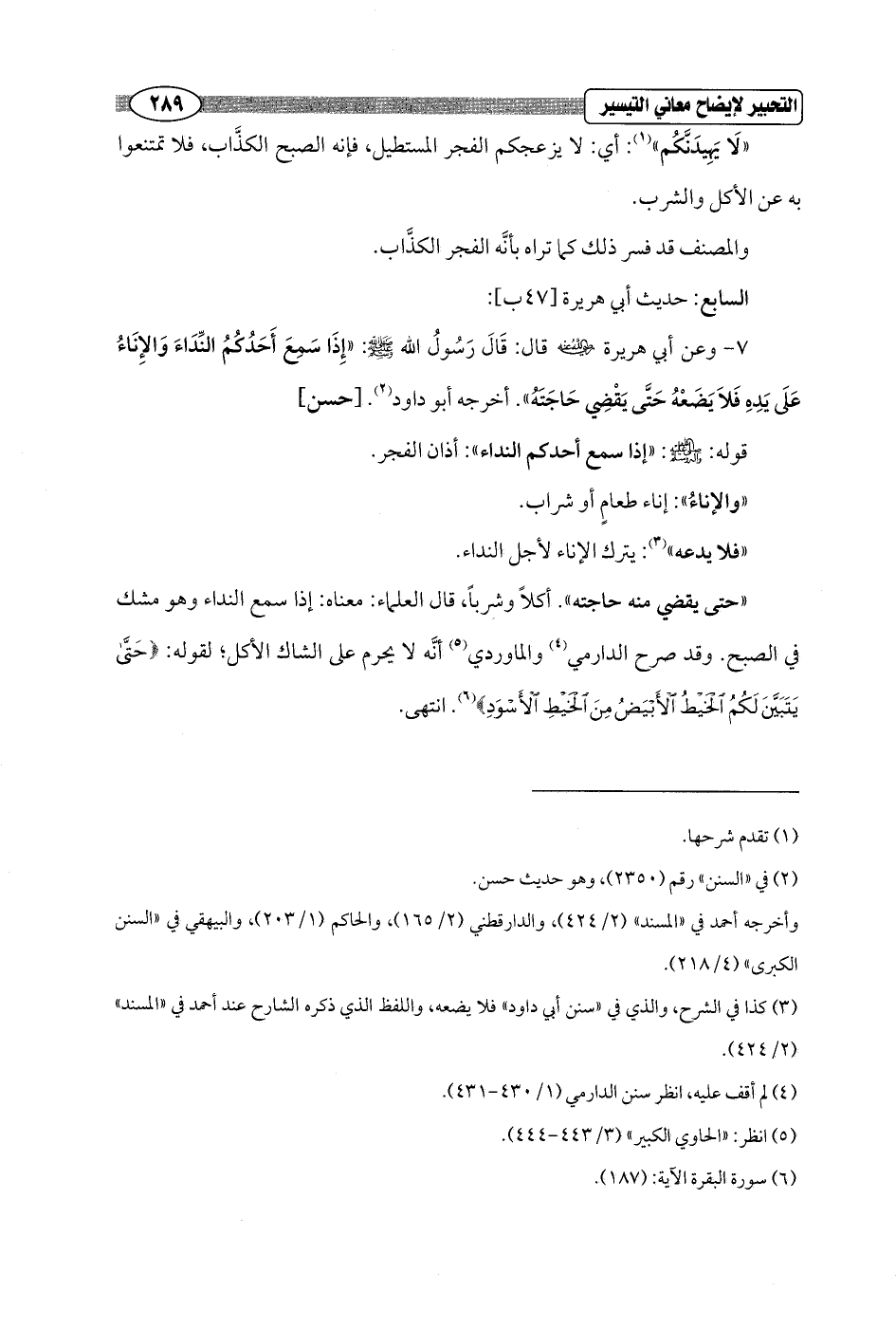 "حتى يقضي منه حاجته". أكلاً وشرباً، قال العلماء: معناه: إذا سمع النداء وهو مشك في الصبح. وقد صرح الدارمي (¬4) والماوردي (¬5) أنَّه لا يحرم على الشاك الأكل؛ لقوله: {حَتَّى يَتَبَيَّنَ لَكُمُ الْخَيْطُ الْأَبْيَضُ مِنَ الْخَيْطِ الْأَسْوَدِ} (¬6). انتهى.