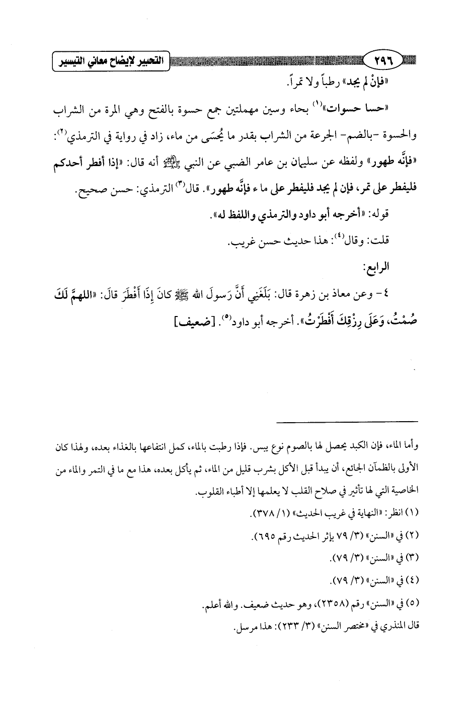 "حسا حسوات" (¬1) بحاء وسين مهملتين جمع حسوة بالفتح وهي المرة من الشراب والحسوة - بالضم - الجرعة من الشراب بقدر ما يُحسَى من ماء، زاد في رواية في الترمذي (¬2): "فإنَّه طهور" ولفظه عن سليمان بن عامر الضبي عن النبي - صلى الله عليه وسلم - أنه قال: "إذا أفطر أحدكم فليفطر على تمر، فإن لم يجد فليفطر على ماء فإنَّه طهور". قال (¬3) الترمذي: حسن صحيح.