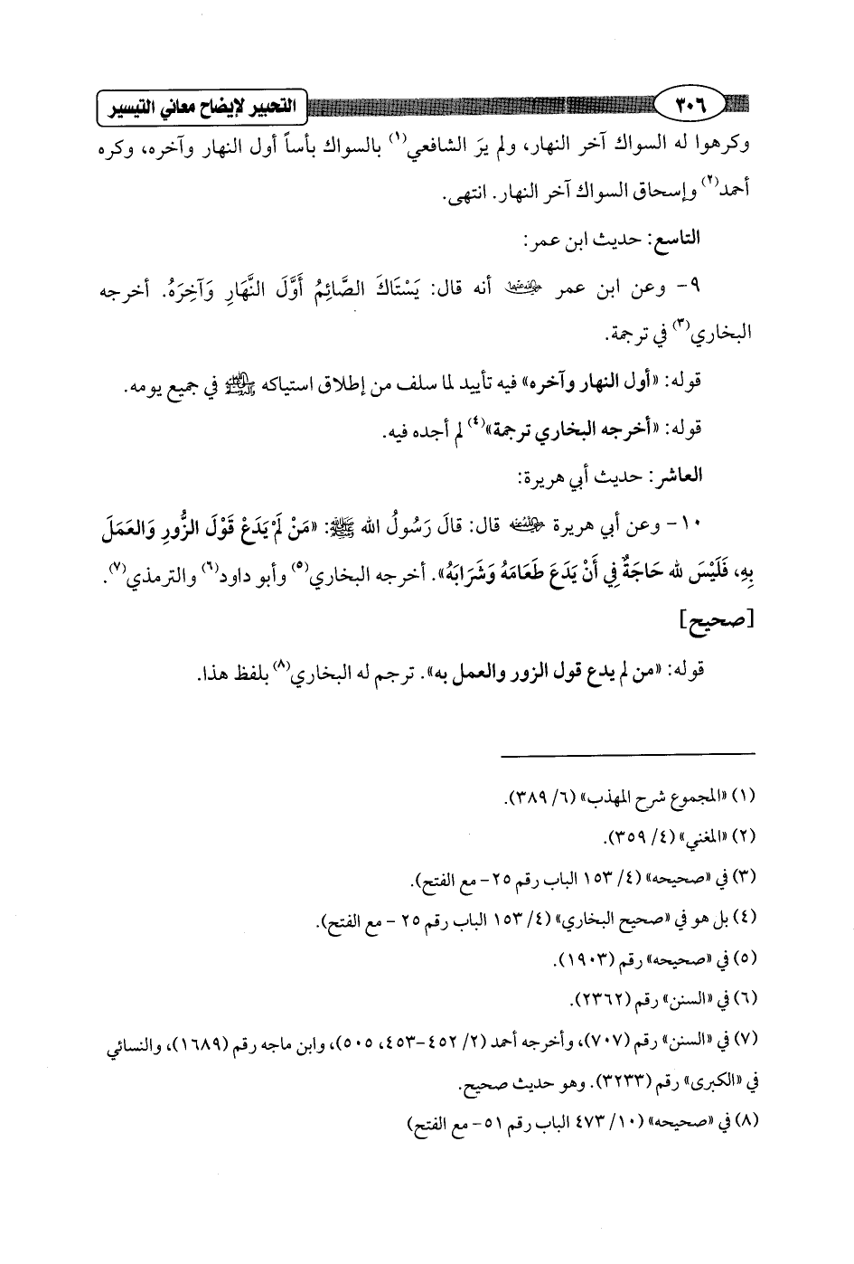 9 - وعن ابن عمر - رضي الله عنهما - أنه قال: يَسْتَاكَ الصَّائِمُ أَوَّلَ النَّهَارِ وَآخِرَهُ. أخرجه البخاري (¬3) في ترجمة.