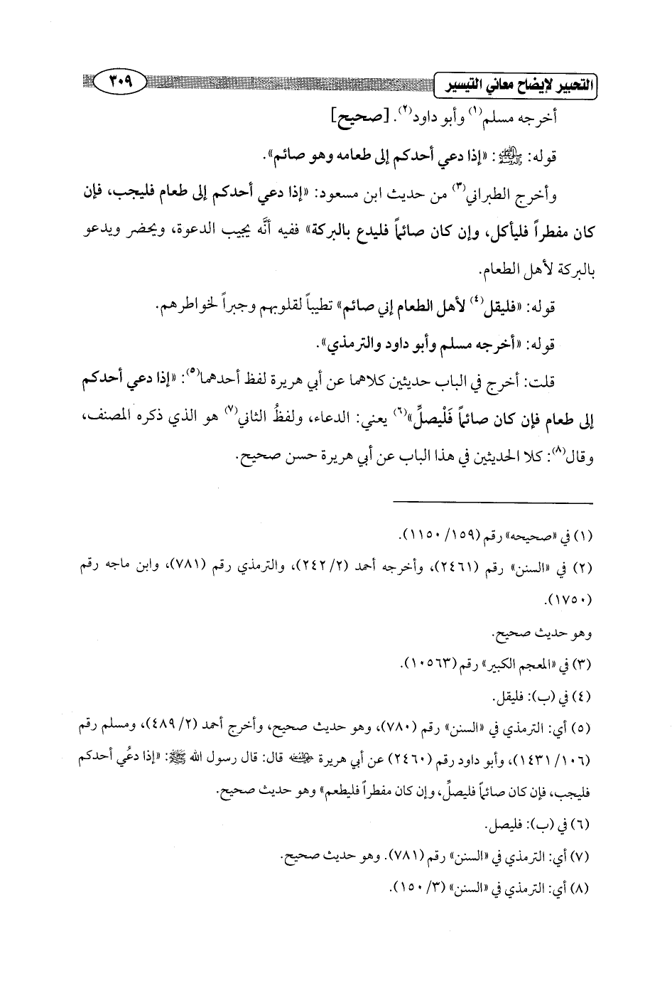 (¬5) أي: الترمذي في "السنن" رقم (780)، وهو حديث صحيح، وأخرج أحمد (2/ 489)، ومسلم رقم (106/ 1431)، وأبو داود رقم (2460) عن أبي هريرة - رضي الله عنه - قال: قال رسول الله - صلى الله عليه وسلم -: "إذا دُعي أحدكم فليجب، فإن كان صائماً فليصلِّ، وإن كان مفطراً فليطعم" وهو حديث صحيح.