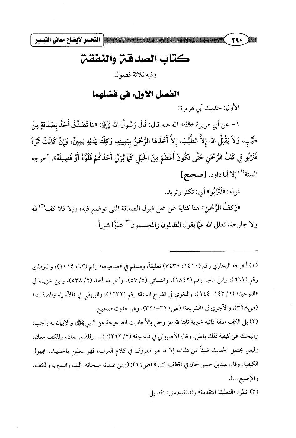 "وَكفُّ الرَّحْمنِ" هنا كناية عن محل قبول الصدقة التي توضع فيه، وإلا فلا كف (¬2) لله ولا جارحة، تعالى الله عمَّا يقول الظالمون والمجسمون (¬3) علوًّا كبيراً.