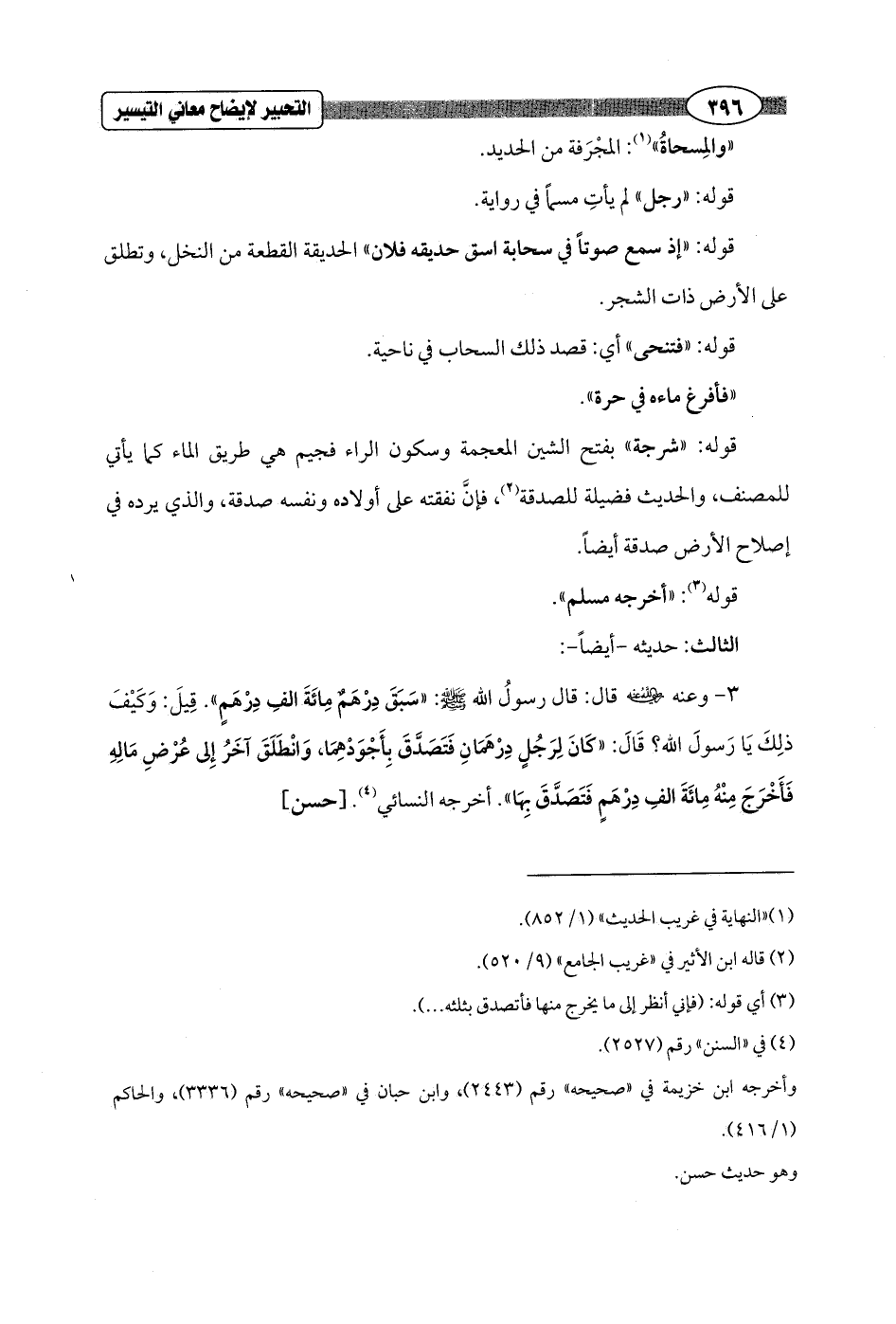 3 - وعنه - رضي الله عنه - قال: قال رسولُ الله - صلى الله عليه وسلم -: "سَبَقَ دِرْهَمٌ مِائَةَ الفِ دِرْهَمٍ". قِيلَ: وَكَيْفَ ذلِكَ يَا رَسولَ الله؟ قَالَ: "كَانَ لِرَجُلٍ دِرْهَمَانِ فَتَصَدَّقَ بِأَجْوَدْهِمَا، وَانْطَلَقَ آخَرُ إِلى عُرْضِ مَالِهِ فَأَخْرَجَ مِنْهُ مِائَةَ الفِ دِرْهَمٍ فَتَصَدَّقَ بِهَا". أخرجه النسائي (¬4). [حسن]