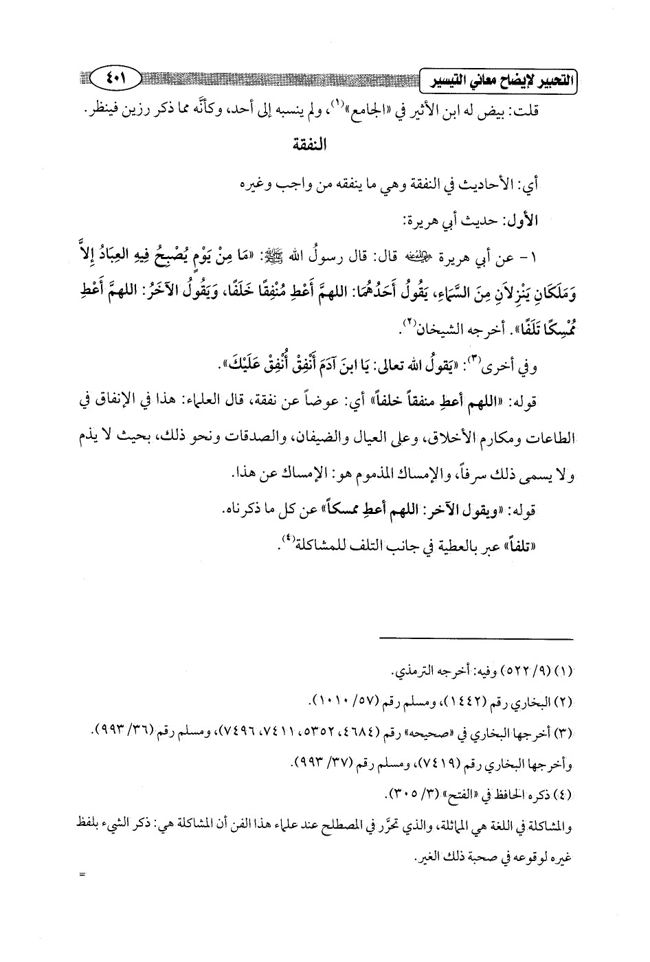 1 - عن أبي هريرة - رضي الله عنه - قال: قال رسولُ الله - صلى الله عليه وسلم -: "مَا مِنْ يَوْمٍ يُصْبِحُ فِيهِ العِبَادُ إِلاَّ وَمَلَكَانِ يَنْزِلاَنِ مِنَ السَّمَاءِ, يَقُولُ أَحَدُهُمَا: اللهمَّ أَعْطِ مُنْفِقًا خَلَفًا، وَيَقُولُ الآخَرُ: اللهمَّ أَعْطِ مُمْسِكًا تَلَفًا". أخرجه الشيخان (¬2).