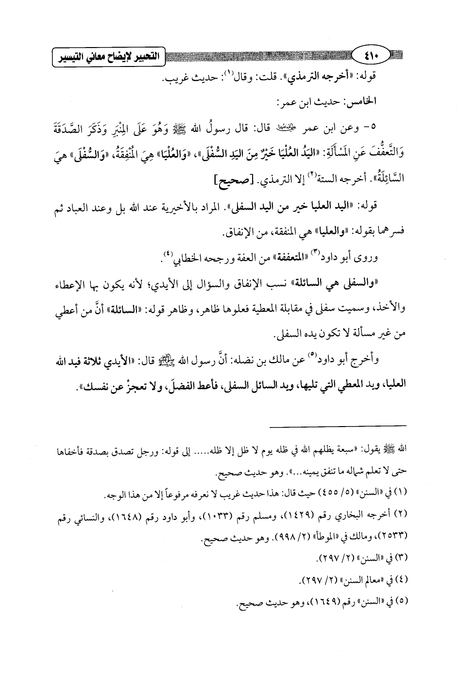 5 - وعن ابن عمر - رضي الله عنهما - قال: قال رسولُ الله - صلى الله عليه وسلم - وَهُوَ عَلَى المِنْبَرِ وَذَكَرَ الصَّدَقَةَ وَالتَّعفُّفَ عَنِ المَسْأَلَةِ: "اليَدُ العُلْيَا خَيْرٌ مِنَ اليَدِ السُّفْلَى"، "وَالعُلْيَا" هِيَ المُنْفِقَةُ، "وَالسُّفْلَى" هيَ السَّائِلَةُ". أخرجه الستة (¬2) إلا الترمذي. [صحيح]