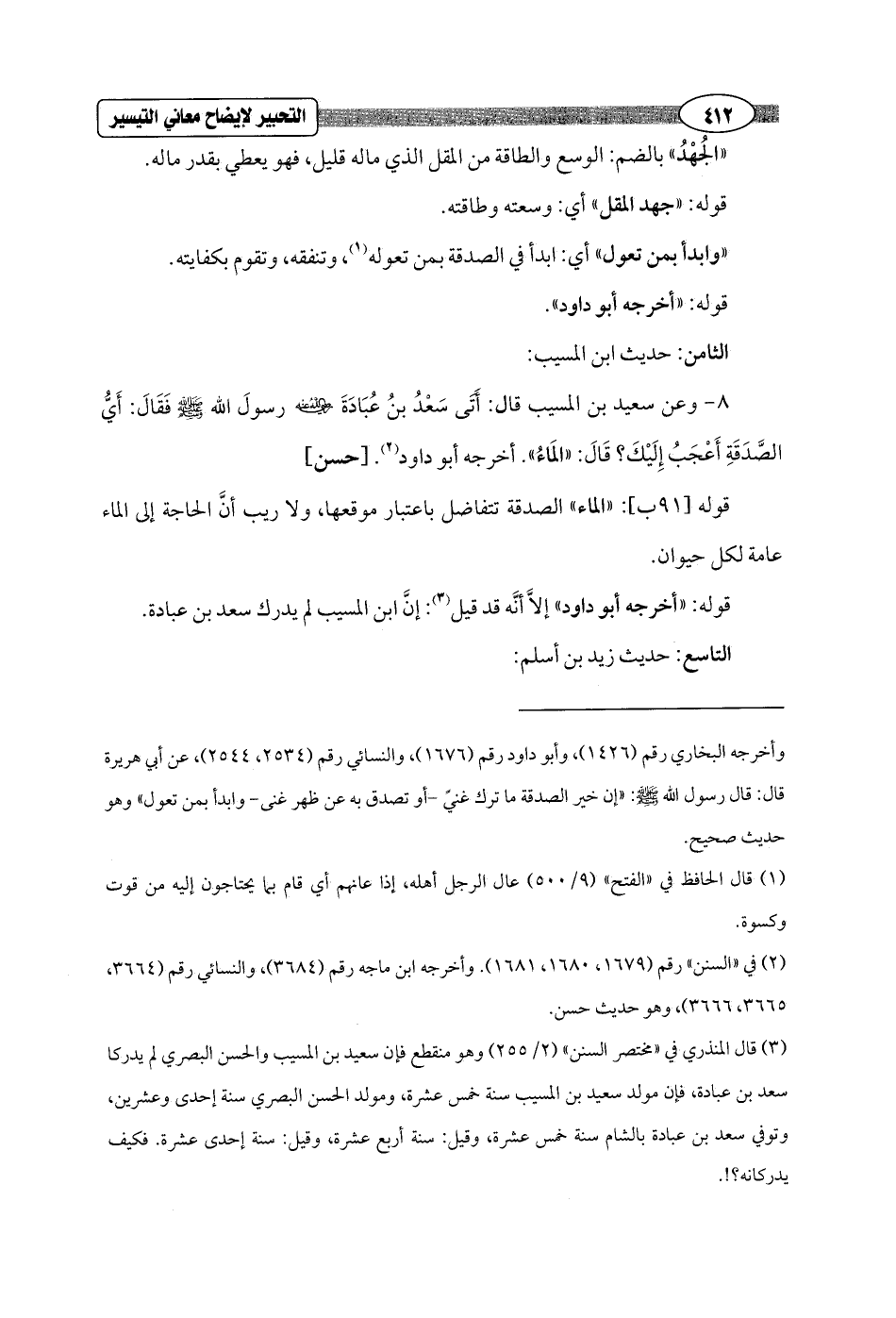 8 - وعن سعيد بن المسيب قال: أَتَى سَعْدُ بنُ عُبَادَةَ - رضي الله عنه - رسولَ الله - صلى الله عليه وسلم - فَقَالَ: أَيُّ الصَّدَقَةِ أَعْجَبُ إِلَيْكَ؟ قَالَ: "المَاءُ". أخرجه أبو داود (¬2). [حسن]
