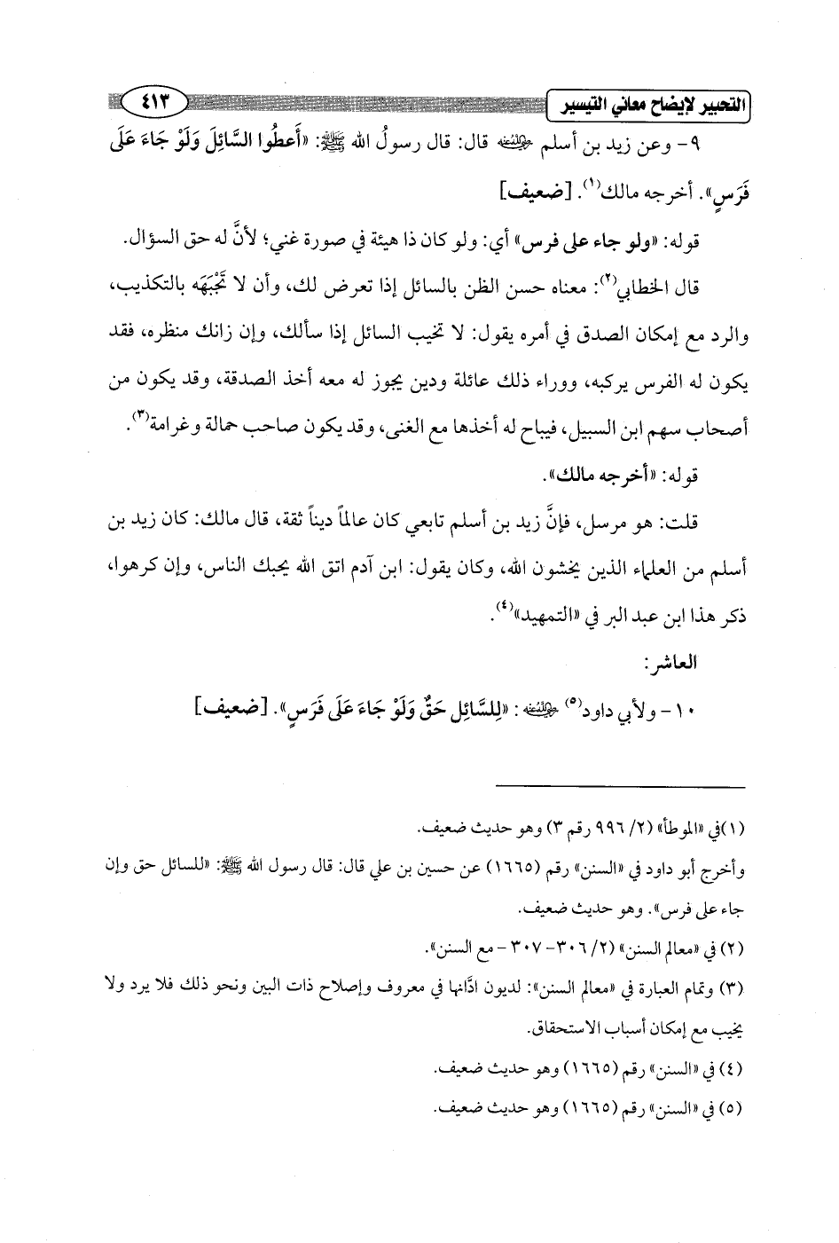 9 - وعن زيد بن أسلم - رضي الله عنه - قال: قال رسولُ الله - صلى الله عليه وسلم -: "أَعطُوا السَّائِلَ وَلَوْ جَاءَ عَلَى فَرَسٍ". أخرجه مالك (¬1). [ضعيف]