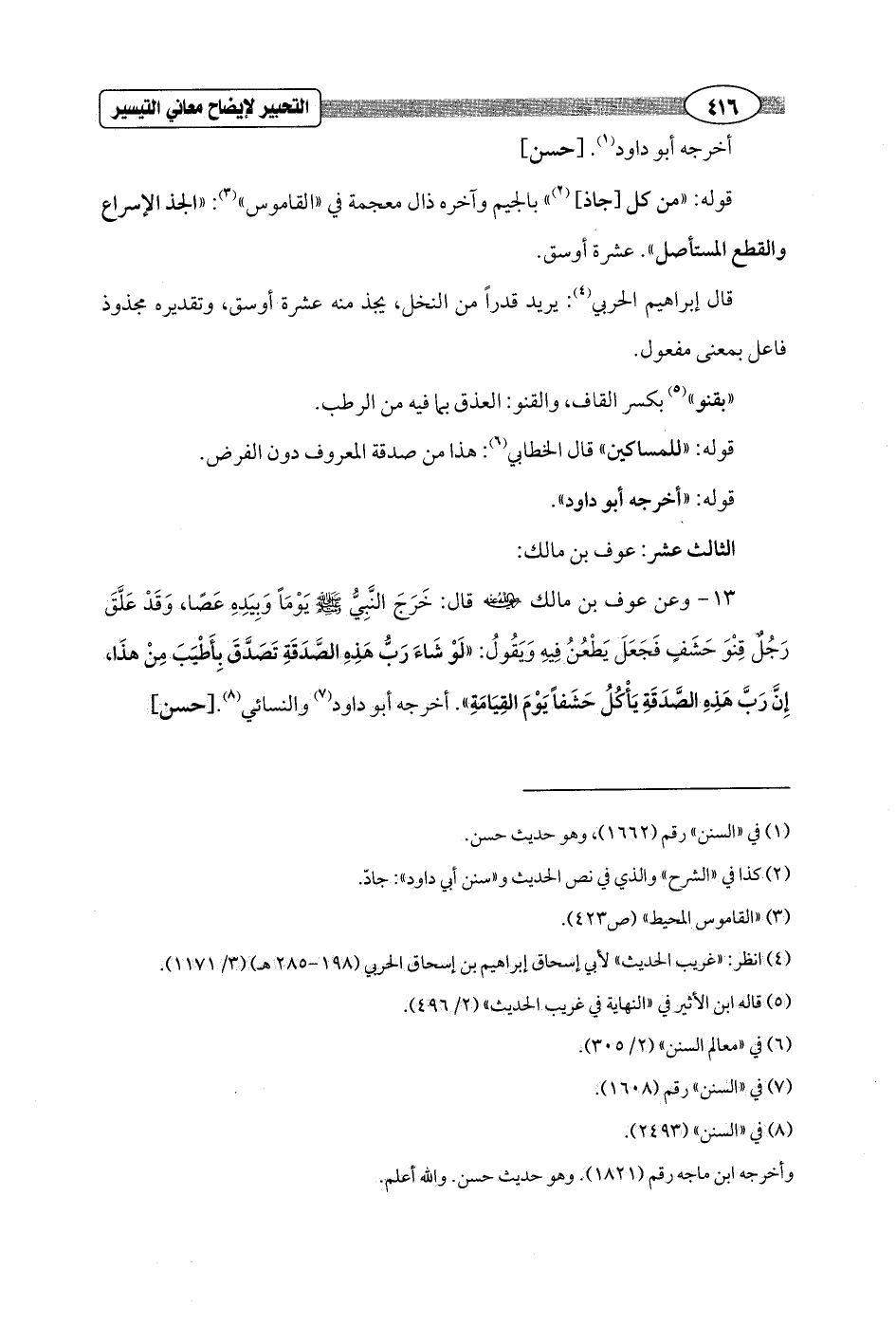 13 - وعن عوف بن مالك - رضي الله عنه - قال: خَرَجَ النَّبِيُّ - صلى الله عليه وسلم - يَوْمَاً وَبِيَدِهِ عَصًا، وَقَدْ عَلَّقَ رَجُلٌ قِنْوَ حَشَفٍ فَجَعَلَ يَطْعُنُ فِيهِ وَيَقُولُ: "لَوْ شَاءَ رَبُّ هَذِهِ الصَّدَقَةِ تَصَدَّقَ بِأَطْيَبَ مِنْ هذَا، إِنَّ رَبَّ هَذِهِ الصَّدَقَةِ يَأْكُلُ حَشَفاً يَوْمَ القِيَامَةِ". أخرجه أبو داود (¬7) والنسائي (¬8). [حسن]