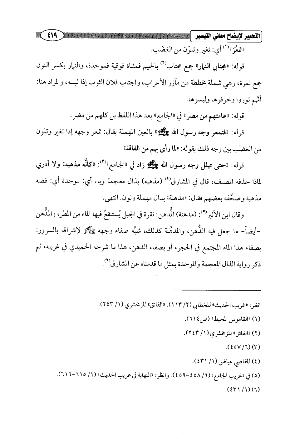 وقال ابن الأثير (¬5): (مدهنة) المُّدهن: نقرة في الجبل يُستنقعُ فيها الماء من المطر، والمدُّهن - أيضاً - ما جعل فيه الدُّهن، والمدهُنة كذلك، شبَّه صفاء وجهه - صلى الله عليه وسلم - لإشراقه بالسرور: بصفاء هذا الماء المجتمع في الحجر، أو بصفاء الدهن، هذا ما شرحه الحميدي في غريبه، ثم ذكر رواية الذال المعجمة والموحدة بمثل ما قدمناه عن المشارق (¬6).