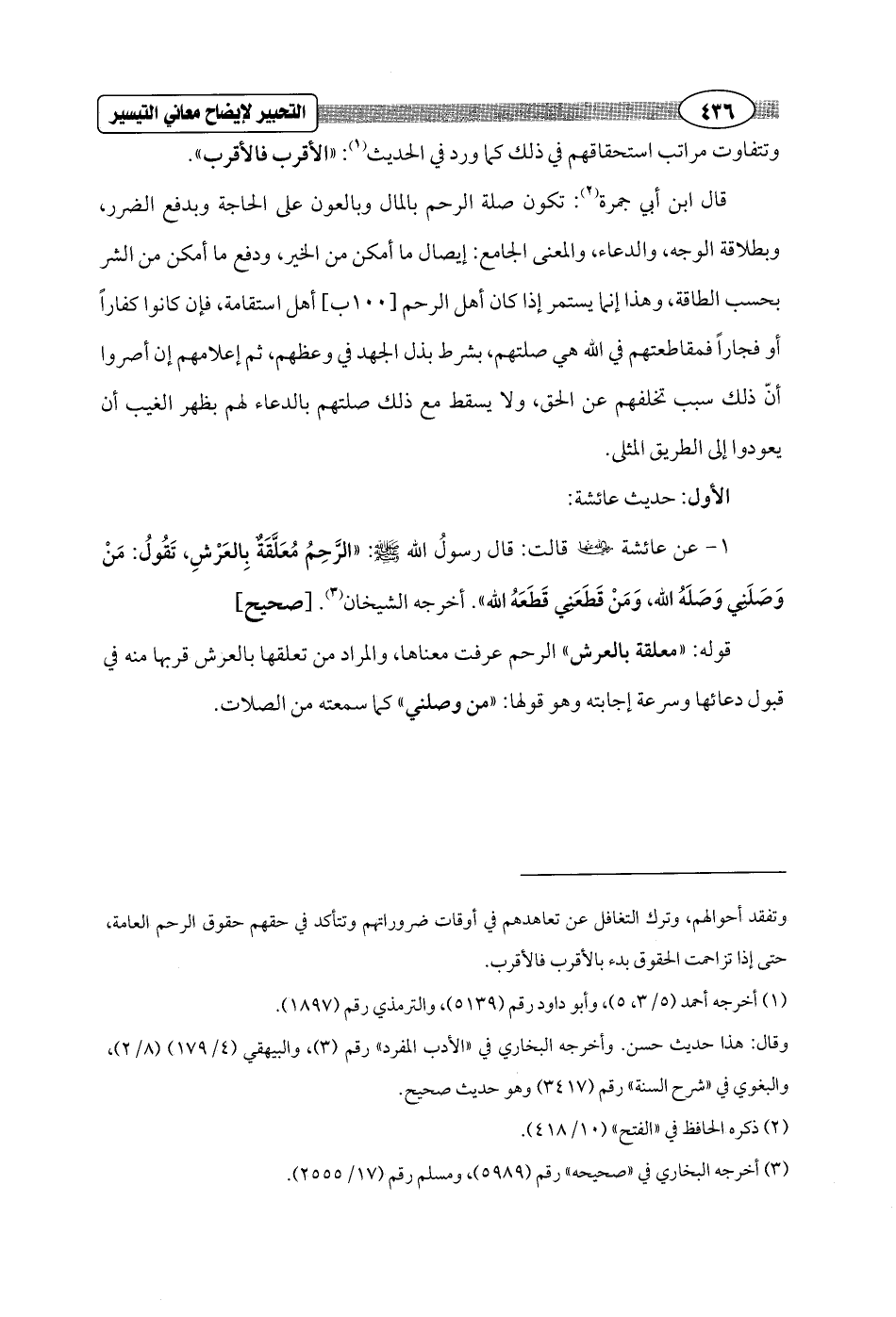 = وتفقد أحوالهم، وترك التغافل عن تعاهدهم في أوقات ضروراتهم وتتأكد في حقهم حقوق الرحم العامة، حتى إذا تزاحمت الحقوق بدء بالأقرب فالأقرب.