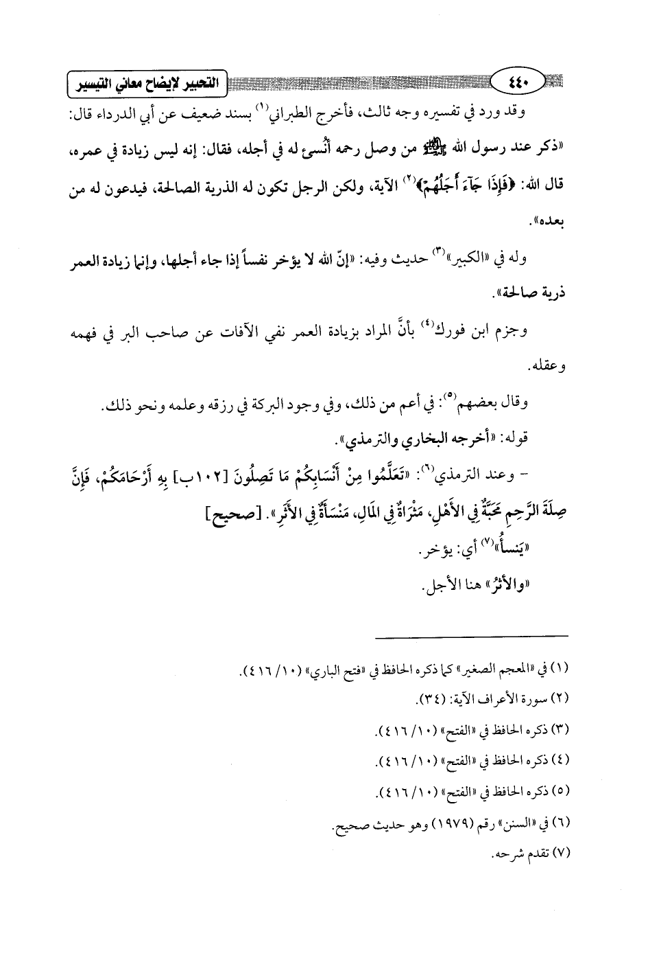 وقد ورد في تفسيره وجه ثالث، فأخرج الطبراني (¬1) بسند ضعيف عن أبي الدرداء قال: "ذكر عند رسول الله - صلى الله عليه وسلم - من وصل رحمه أنسئ له في أجله، فقال: إنه ليس زيادة في عمره, قال الله: {فَإِذَا جَاءَ أَجَلُهُمْ} (¬2) الآية, ولكن الرجل تكون له الذرية الصالحة، فيدعون له من بعده".